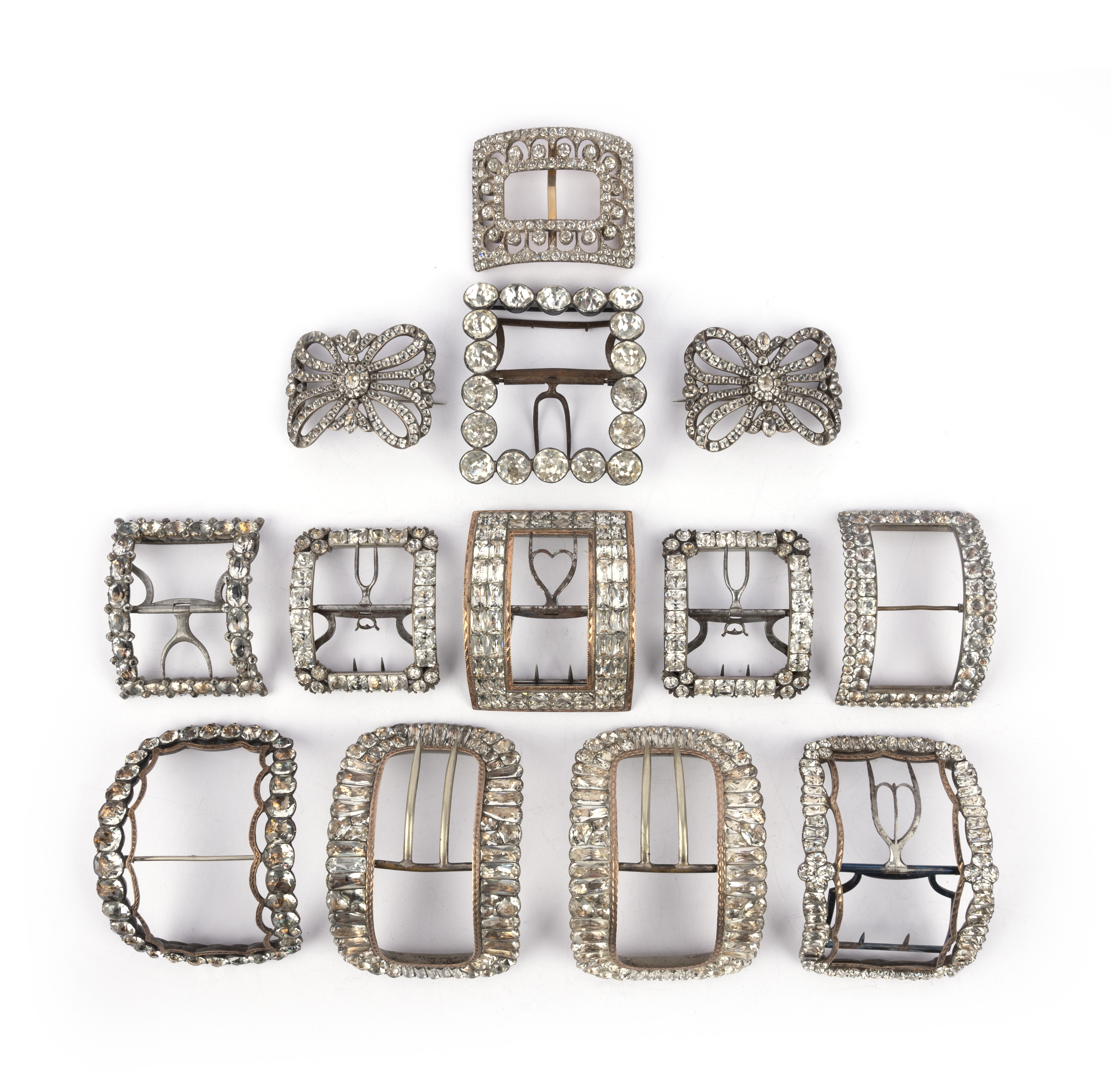 A collection of paste shoe buckles and a pair of brooches, late 18th/early 19th century, comprising: two pairs of buckles set with colourless pastes; together with seven assorted buckles, variously set with colourless pastes, mounted in silver and base metal; largest 9.6 x 5.9cm; and a pair of brooches of bow design, set with colourless pastes, 4 x 5cm each