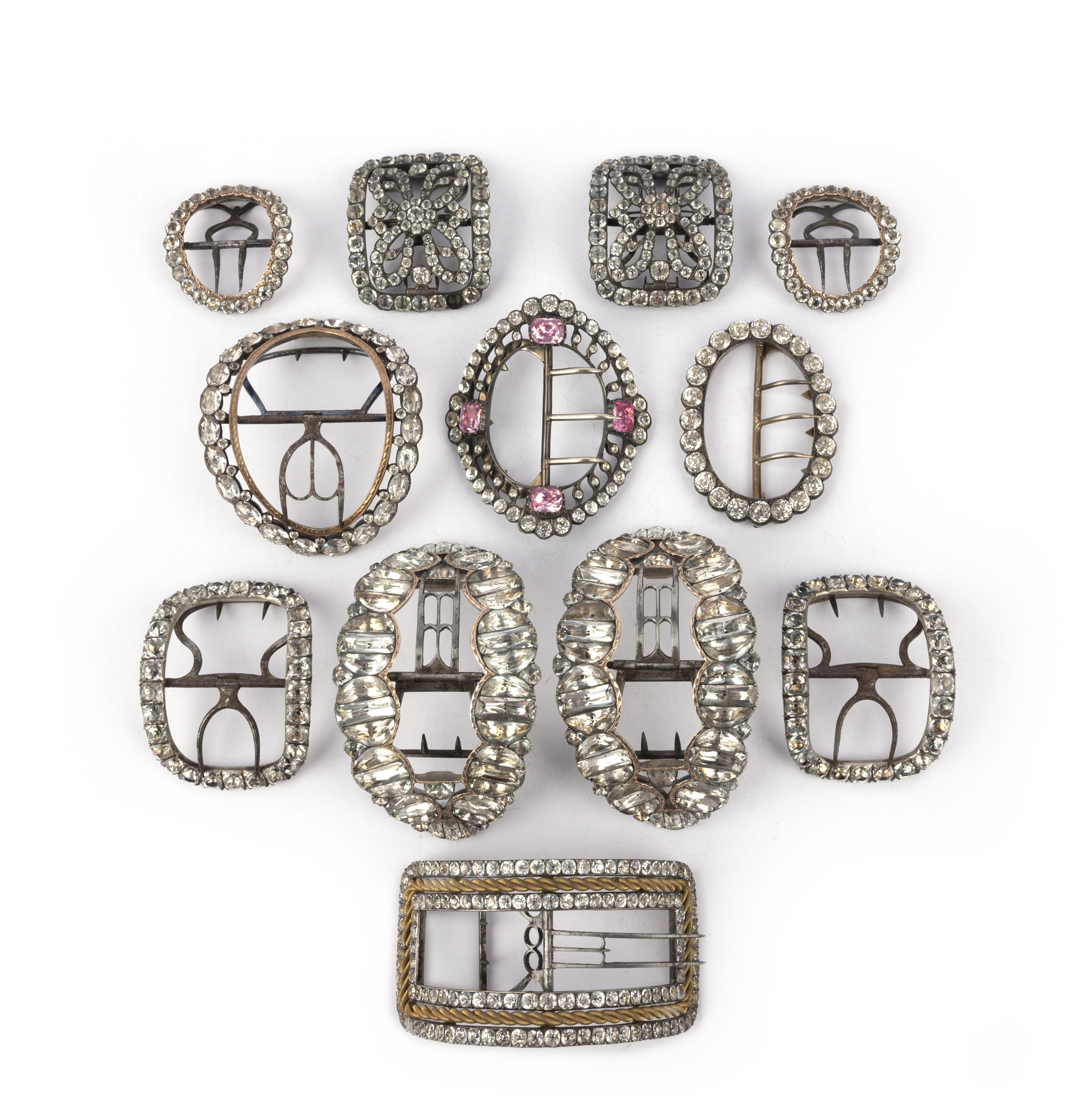 A collection of paste shoe buckles, late 18th/early 19th century, comprising: four pairs of buckles set with colourless pastes; together with four assorted buckles, variously set with colourless pastes, one additionally set with pink pastes, mounted in silver and base metal; largest 10.9 x 5.4cm