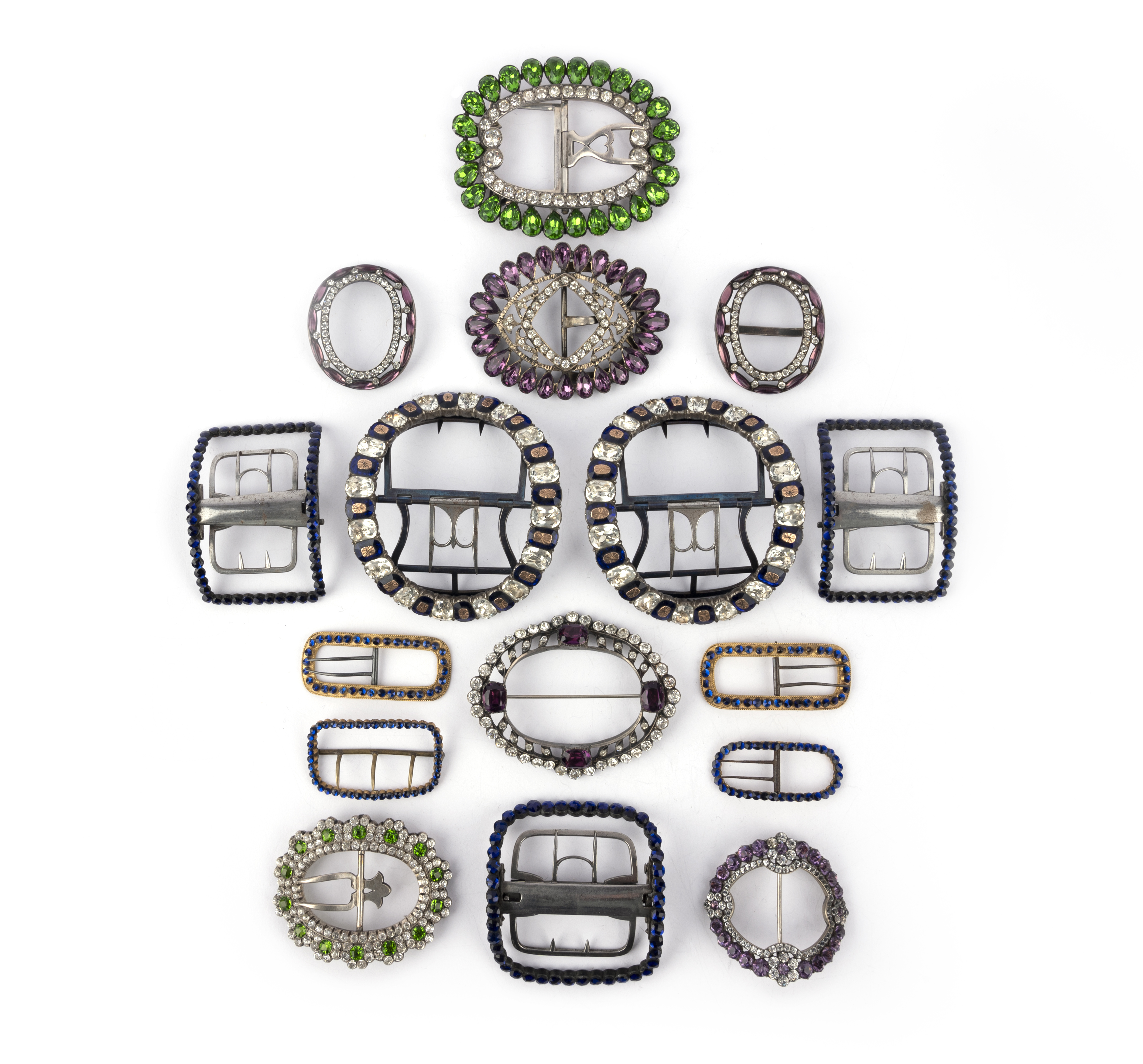 A collection of paste shoe buckles, late 18th/early 19th century, comprising: a pair of blue and colourless paste buckles; two pairs of blue paste buckles; a pair of violet and colourless paste buckles; and eight assorted buckles variously set with blue, violet, green and colourless pastes, mounted in silver and base metal; largest 8 x 7cm