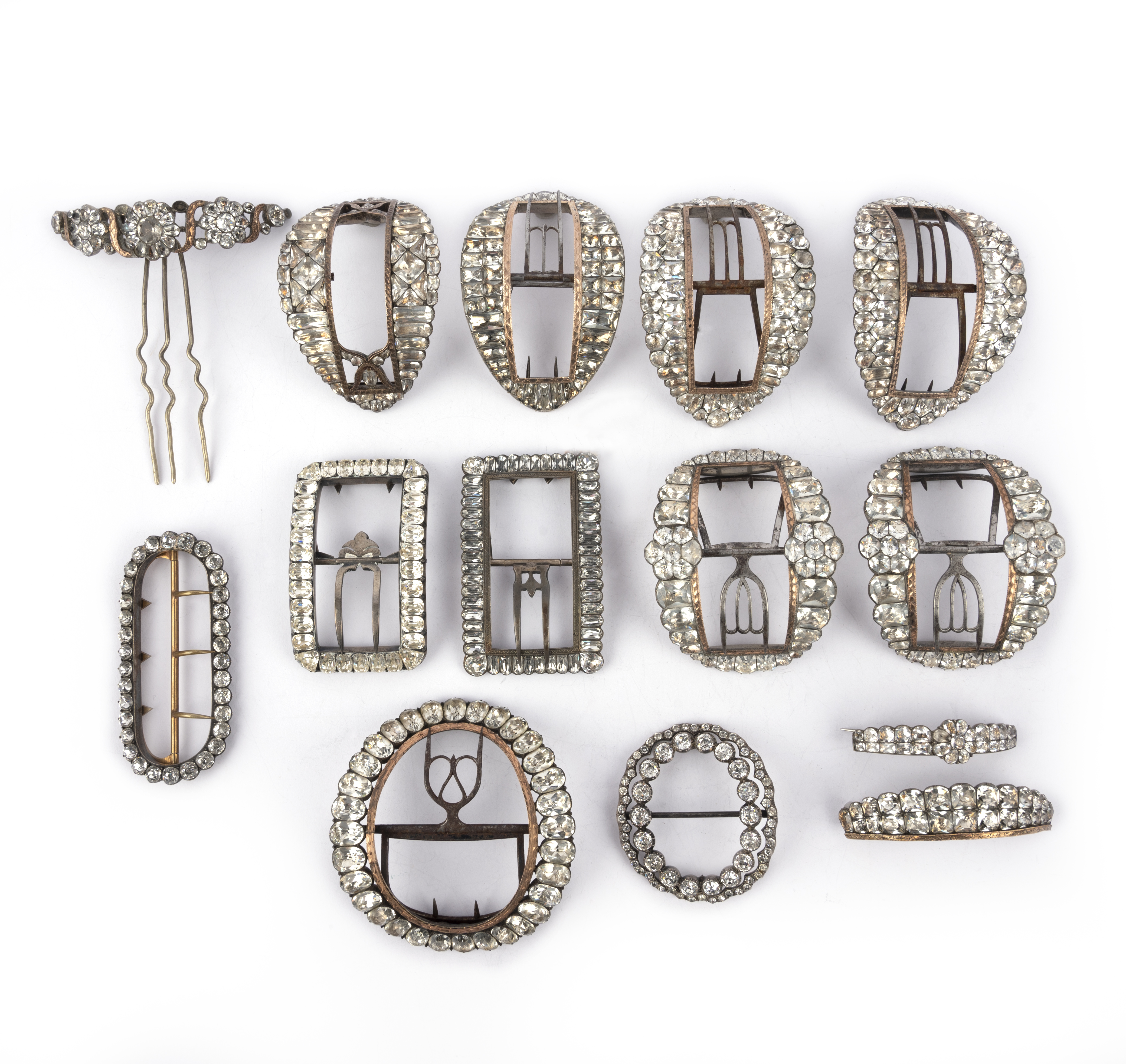 A collection of paste shoe buckles, brooches and a hair ornament, late 18th/early 19th century, comprising: two pairs of buckles set with colourless pastes; together with six assorted buckles, variously set with colourless pastes, mounted in silver and base metal; largest 9.5 4.9cm; together with three brooches and a hair ornament, each set with colourless pastes