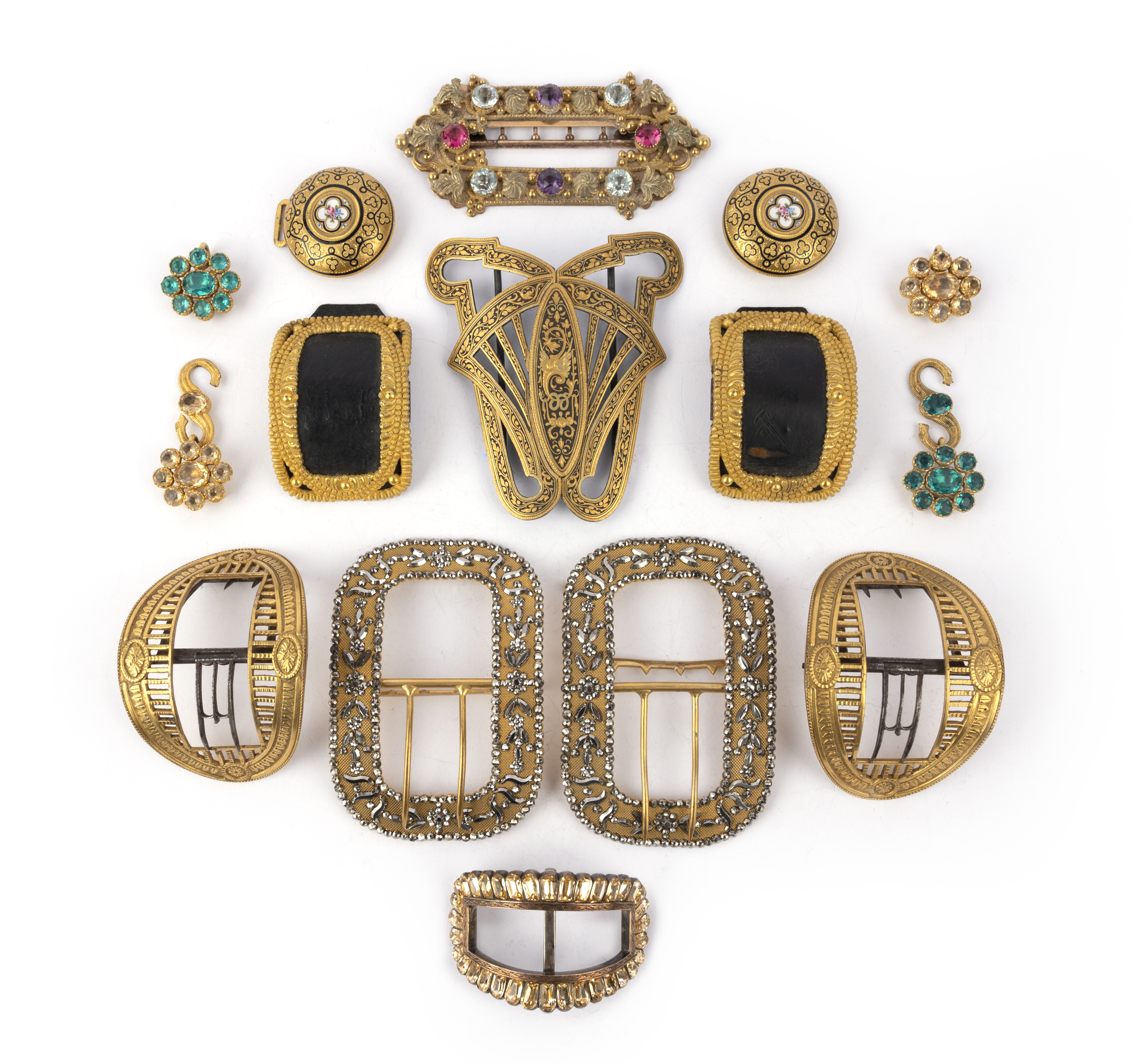 A collection of gilt metal and paste buckles, 18th/19th century, comprising: a pair of gilt metal and cut steel buckles; a buckle set with orange pastes; a foliate gilt metal buckle set with variously coloured pastes; two buckles set with clusters of orange and green pastes, centring on hooks modelled as snakes; two pairs of gilt metal shoe buckles, including one pair mounted on leather; a gilt metal and enamel buckle; and a large gilt and blackened metal belt buckle, 9 x 8.2cm
