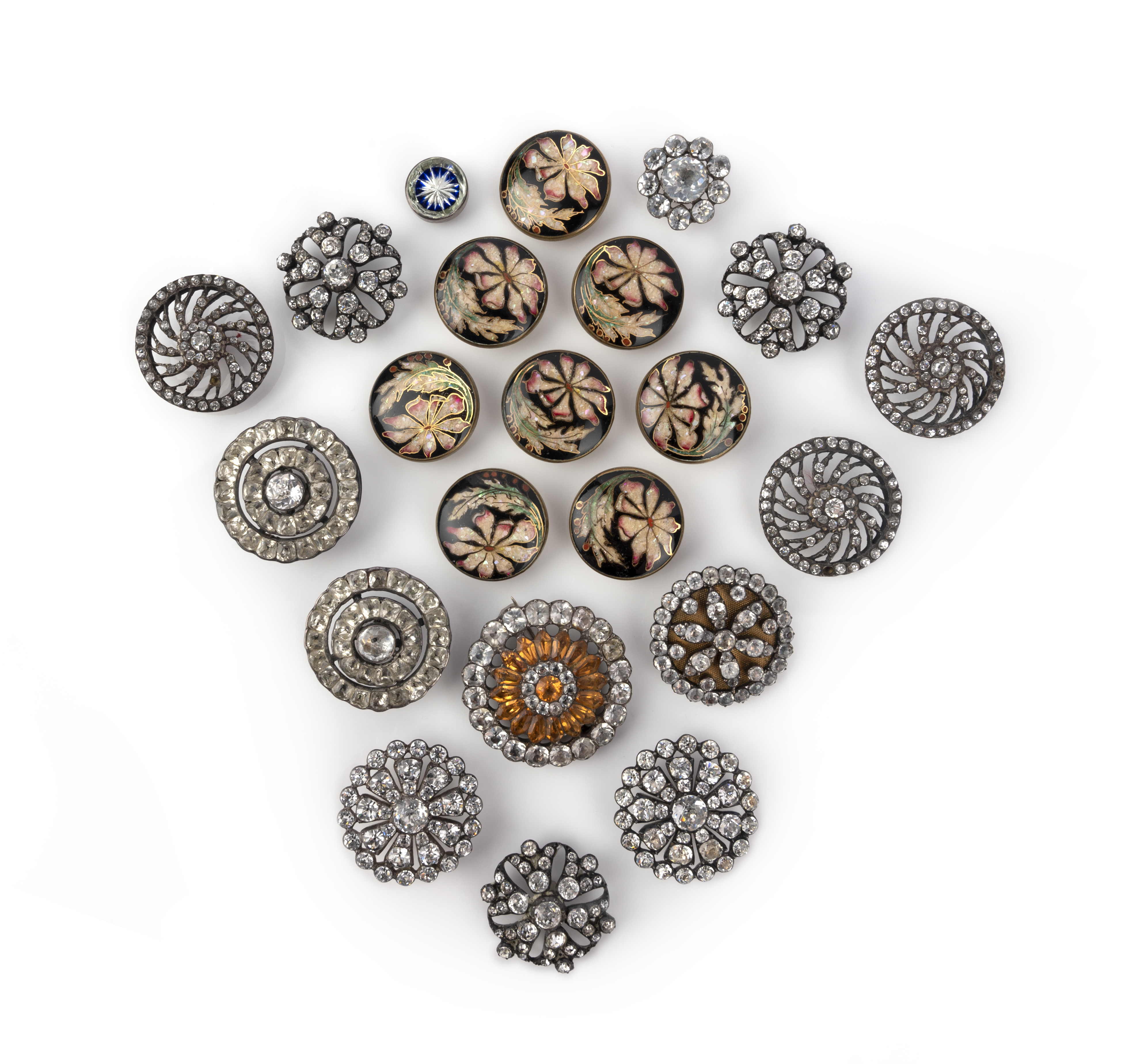 A group of buttons, 18th- early 20th century, comprising: two pairs and two groups of three matching buttons set with faceted colourless pastes, largest 2.9cm diameter; a button set with orange and colourless pastes adapted as a brooch, 3.6cm diameter; a set of eight buttons set with coloured mother of pearl mosaics depicting floral sprays on a black ground, mounted in gilt metal, diameters 2.4cm each; and three additional paste buttons