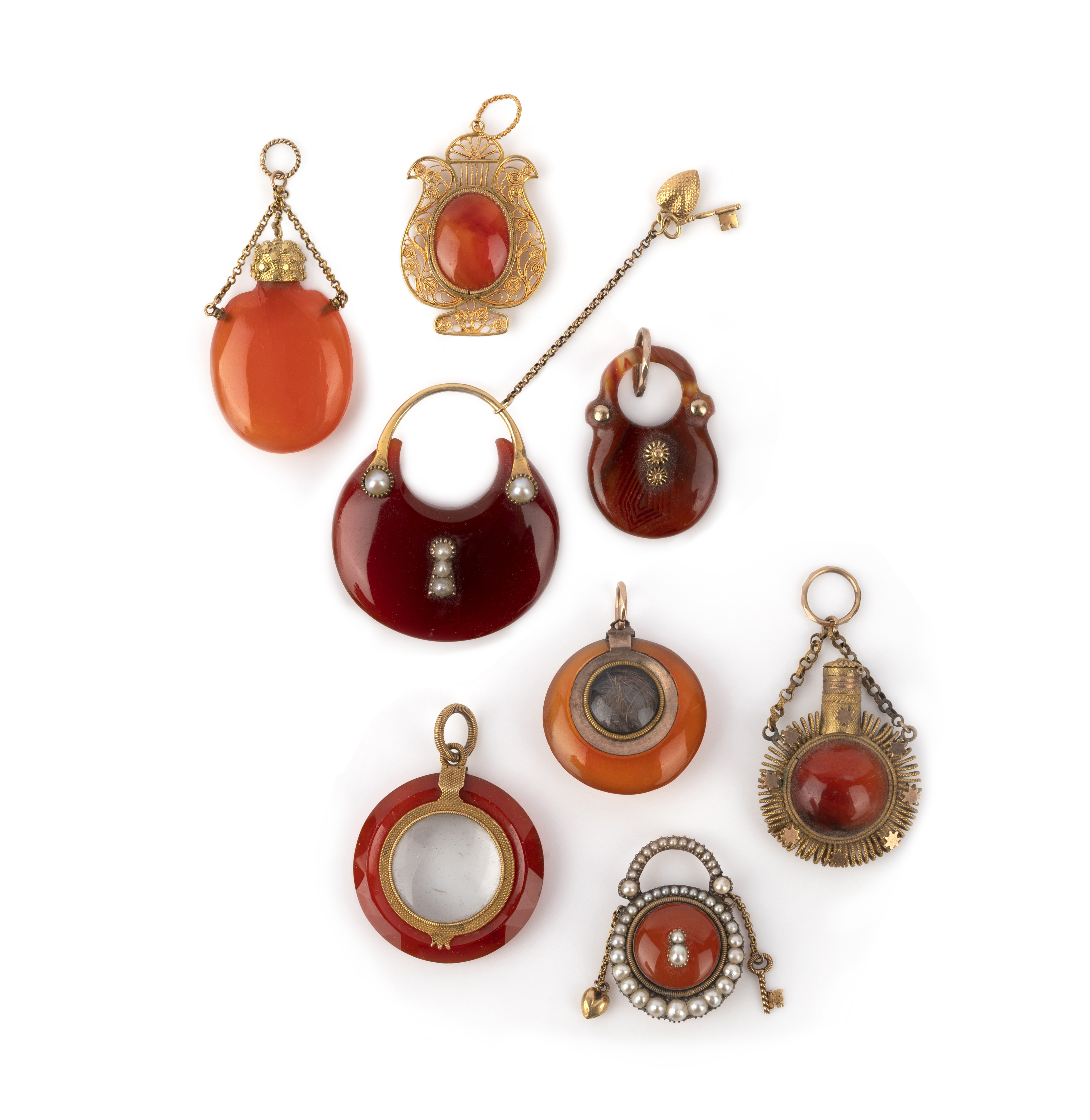 A group of eight Georgian carnelian pendants, early 19th century, comprising: two pendants designed as a padlocks, the larger accented with half pearls and suspending a small gold heart and key, larger measuring 3.5 x 3.1cm, pearls untested; a carnelian scent bottle with a gold cap, suspended from a gold chain; a pendant modelled as a lyre in gold filigree, set with polished carnelian, one pendant designed as a flask, set with polished carnelian, the border of coiled rope work, the top with a hinged lid; a circular carnelian pendant with a glazed central compartment enclosing hairwork; an additional carnelian pendant with a central glazed compartment; and a pendant designed as a padlock set with polished carnelian and bordered with half pearls, largest 4.5cm