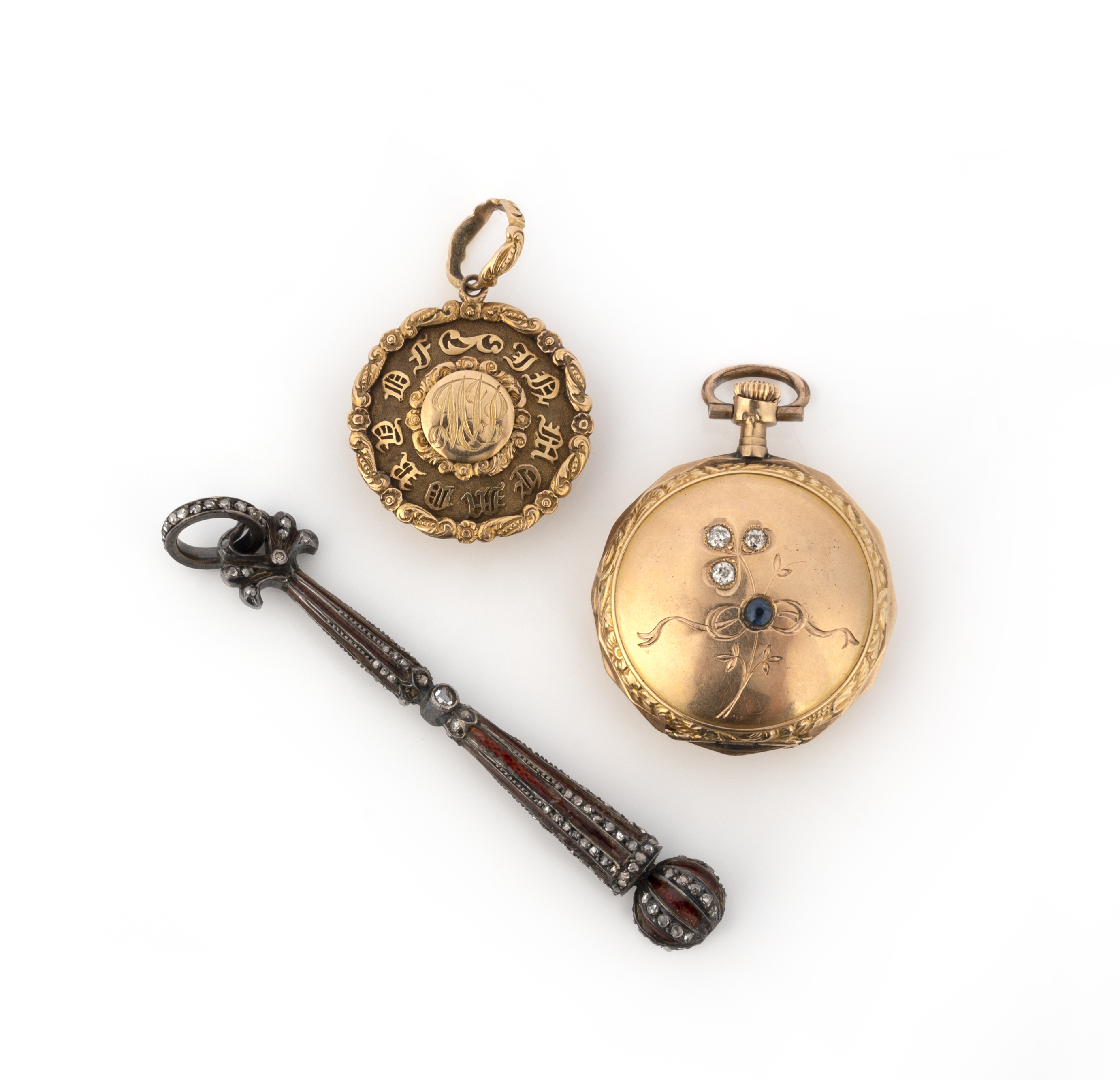A sapphire and diamond pocket watch, early 20th century, and two pendants, 19th century, the pocket watch engraved with a trefoil and set with circular-cut diamonds and a circular-cut sapphire, opening to reveal a black, white and gold enamelled face, length 4cm including suspension hoop, the interior signed Landon 1922 V/23, numbered 140449 and 449, Swiss and German assay marks for 14ct gold, minute hand deficient; together with an elongated guilloché enamel and rose-cut diamond pendant, length 6.7cm, end deficient; and a circular gold mourning locket pendant, the front reading 'In Memory Of', enclosing initials, the reverse with a glazed compartment, and inscribed 'Mrs Sarah Fuller, died 13 Augt 1828 Aged 72', length 3.4cm including bail