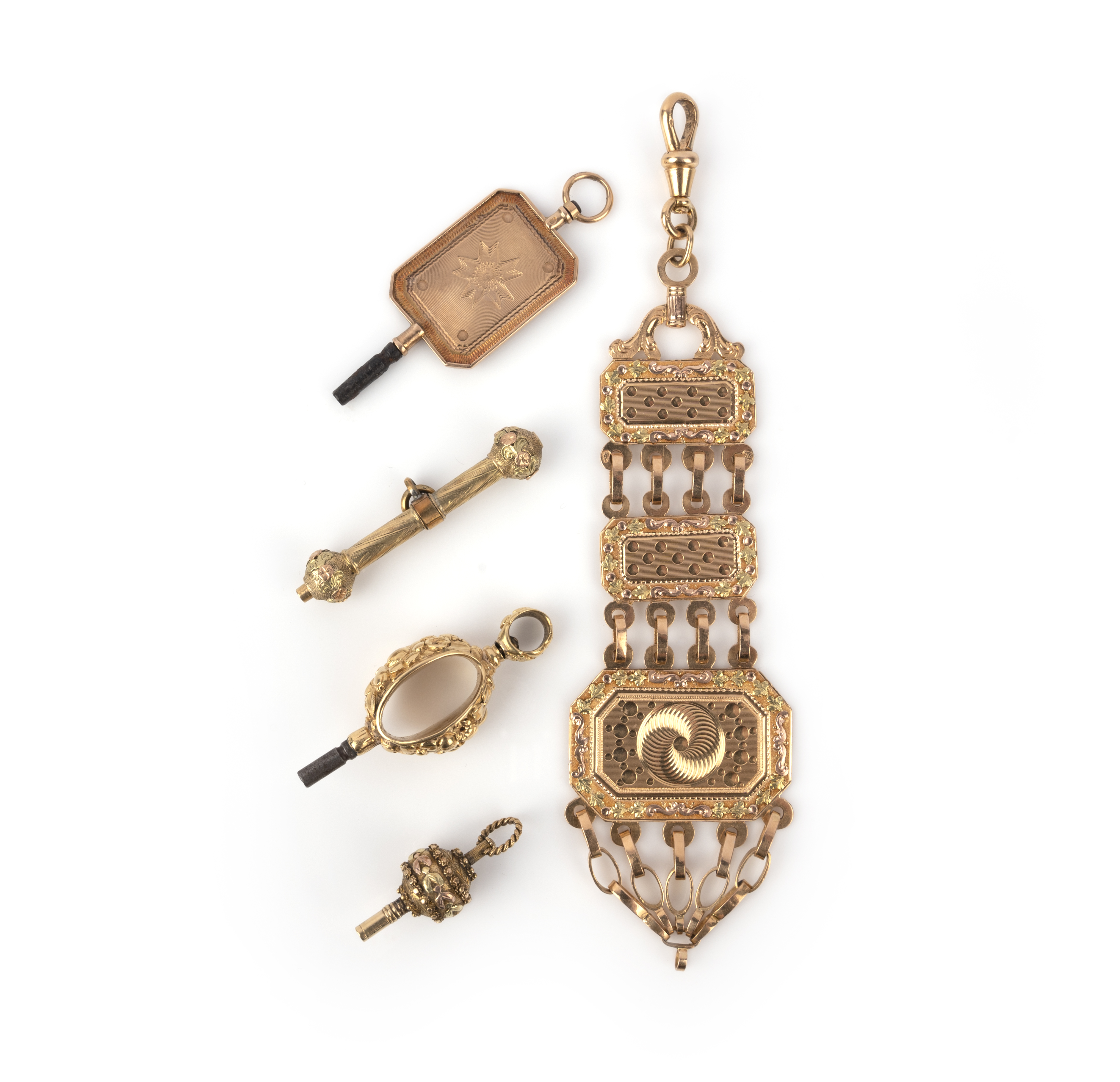 A gold chatelaine and four gold watch keys, early 19th century, comprising: a gold chatelaine, composed of engine-turned panels in varicoloured gold, connected by chain linking, length 13.9cm, French recall mark for 1809, partial French maker's mark; three watch keys of floral design, longest 4.5cm; and one of cut-cornered rectangular outline with engine turned engraving, length 5.4cm, assay mark