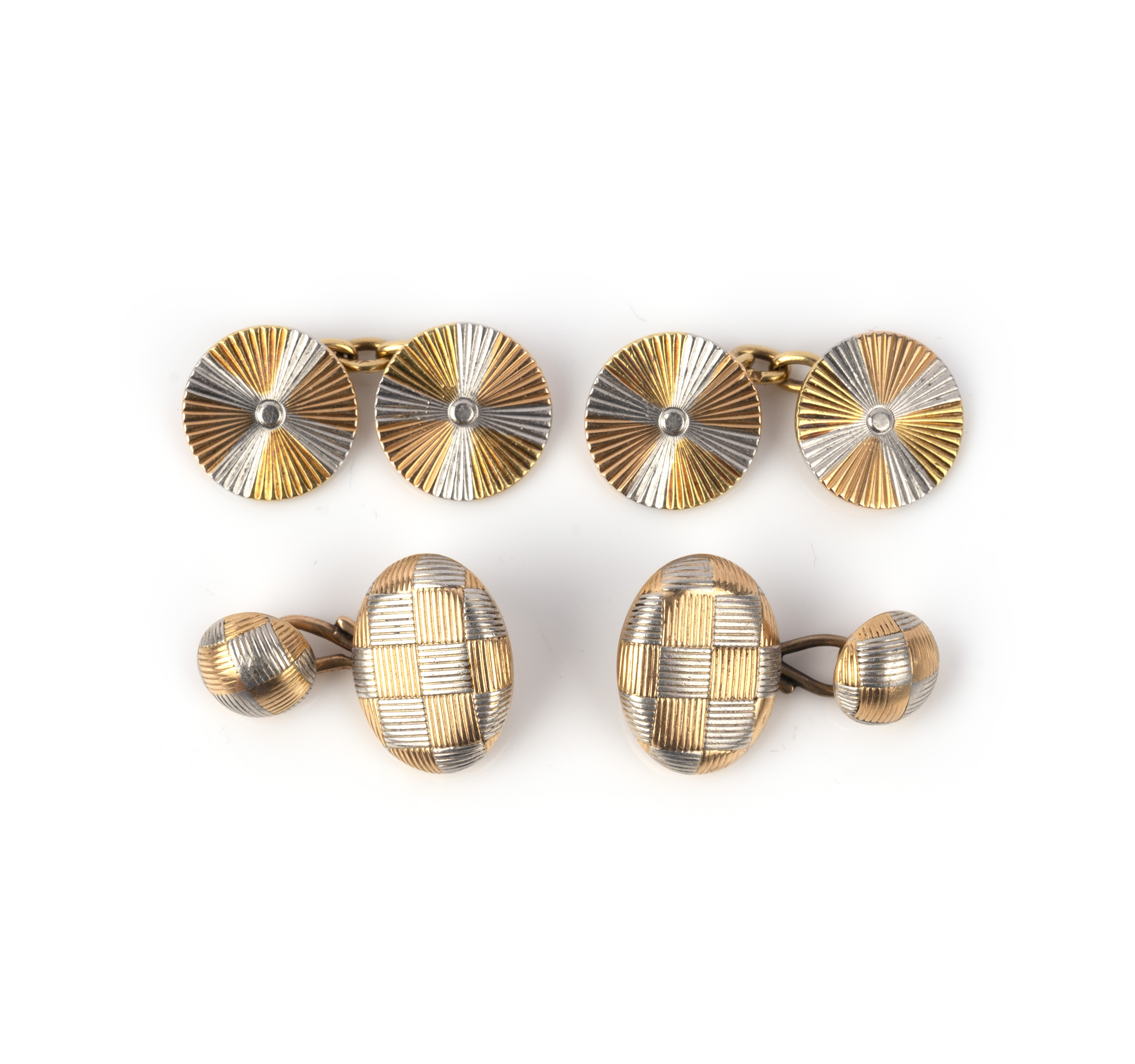 Two pairs of gold cufflinks, early 20th century, comprising: a pair of cufflinks, the larger oval and smaller circular ends each with a grid design in bicoloured gold, to S-shaped connecting links, larger ends each 1.8 x 1.4cm, case; and a pair of cufflinks composed of circular ends with radiating designed in three-coloured gold, to chain connectors, diameter of each end 0.9cm, case