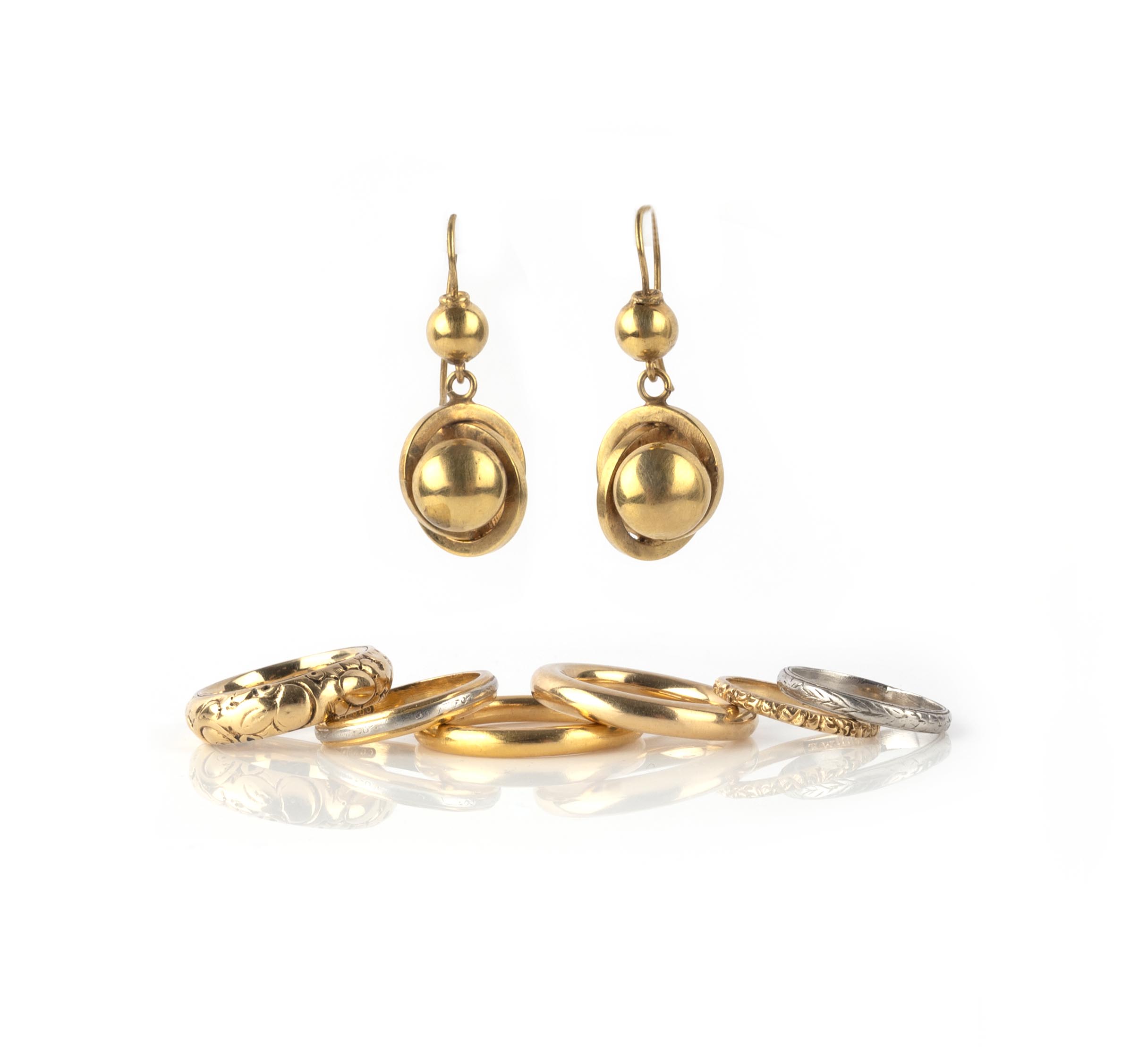 Six wedding bands and a pair of earrings, 19th and early 20th century