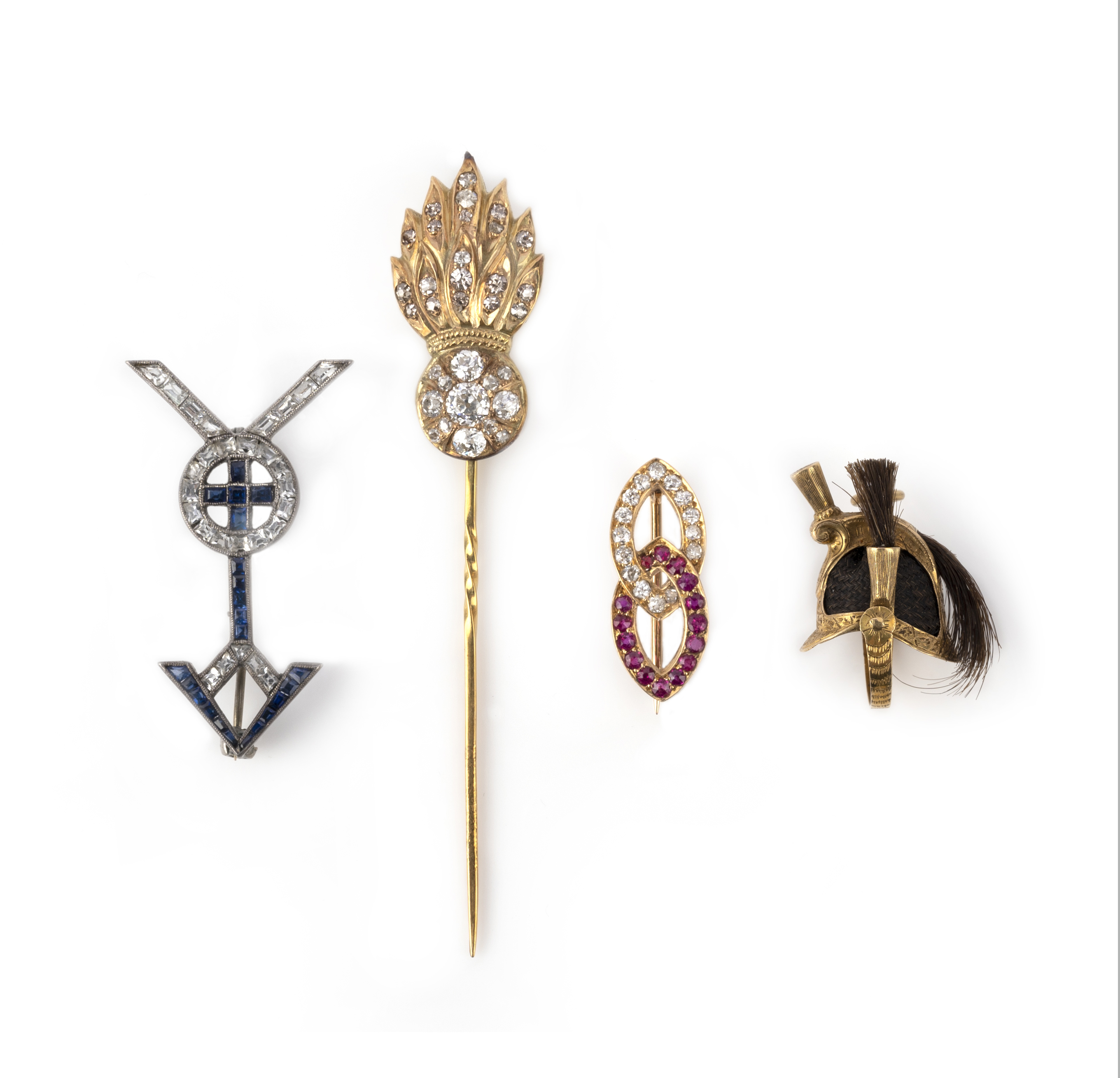 A collection of three brooches and a hairwork charm, late 19th/early 20th century, comprising: a stickpin, the top with the badge of the Grenadier Guards, set with cushion-shaped diamonds, mounted in gold, length 7.7cm; a brooch designed as conjoined hoops set with circular-cut diamonds and rubies, mounted in gold, length 2.2cm, dated 27.04.1905; a brooch of abstract geometric design set with blue and colourless pastes, length 3.8cm, stamped SCP, and a gold and hair work charm, modelled as a dragoon's helmet, composed of woven hairwork mounted in engraved gold, length 3.3cm