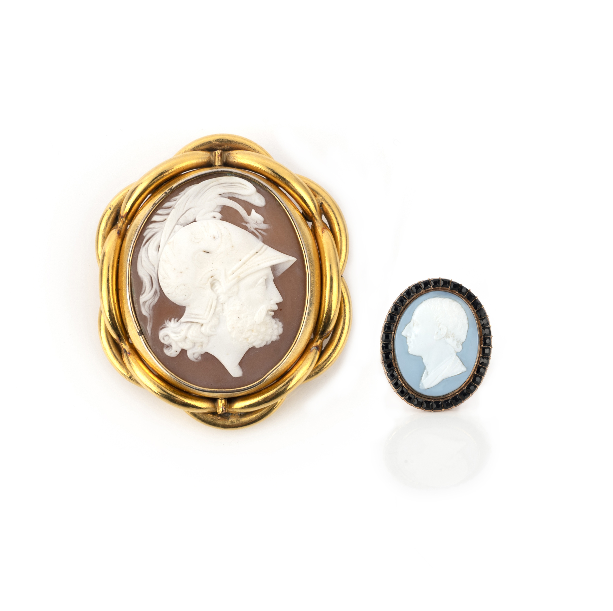 A paste cameo mourning ring, James Tassie, late 18th century, and a shell cameo broooch, mid 19th century, the brooch set with an oval cameo depicting the warrior Ajax, to a gilt metal mount, measuring 5.9 x 5.0cm, the ring set with a moulded cameo in blue and white glass depicting the Rev. James Fordyce (1720-1796), within a border of faceted black glass, to a plain gold mount, size T, dedicatory inscription 'Revd James Fordyce DD, Ob 10 Oct 1796 aet 76'