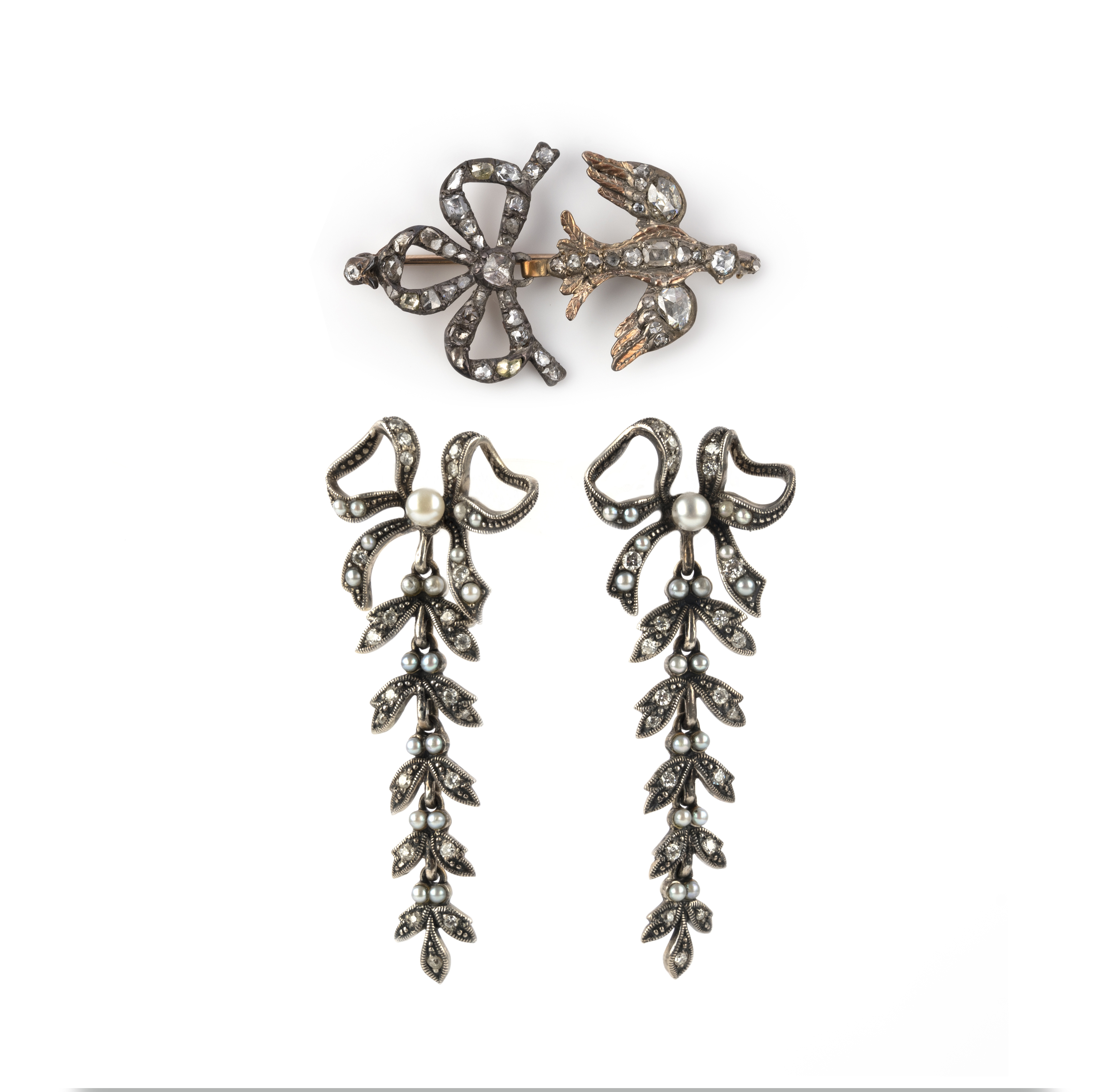 A diamond 'Saint Esprit' pin, 18th century, composite, designed as a bird swooping downwards, set with rose-cut diamonds and suspending a diamond pendant in its beak, to a surmount of ribbon bow design set with rose-cut diamonds, mounted as a pin, length 5.5cm and a pair of seed pearl and diamond earrings, each designed as a bow suspending an articulated line of leaves, set with seed pearls and circular-cut diamonds, mounted in silver, length 5.4cm each, stamped 925, pearls untested