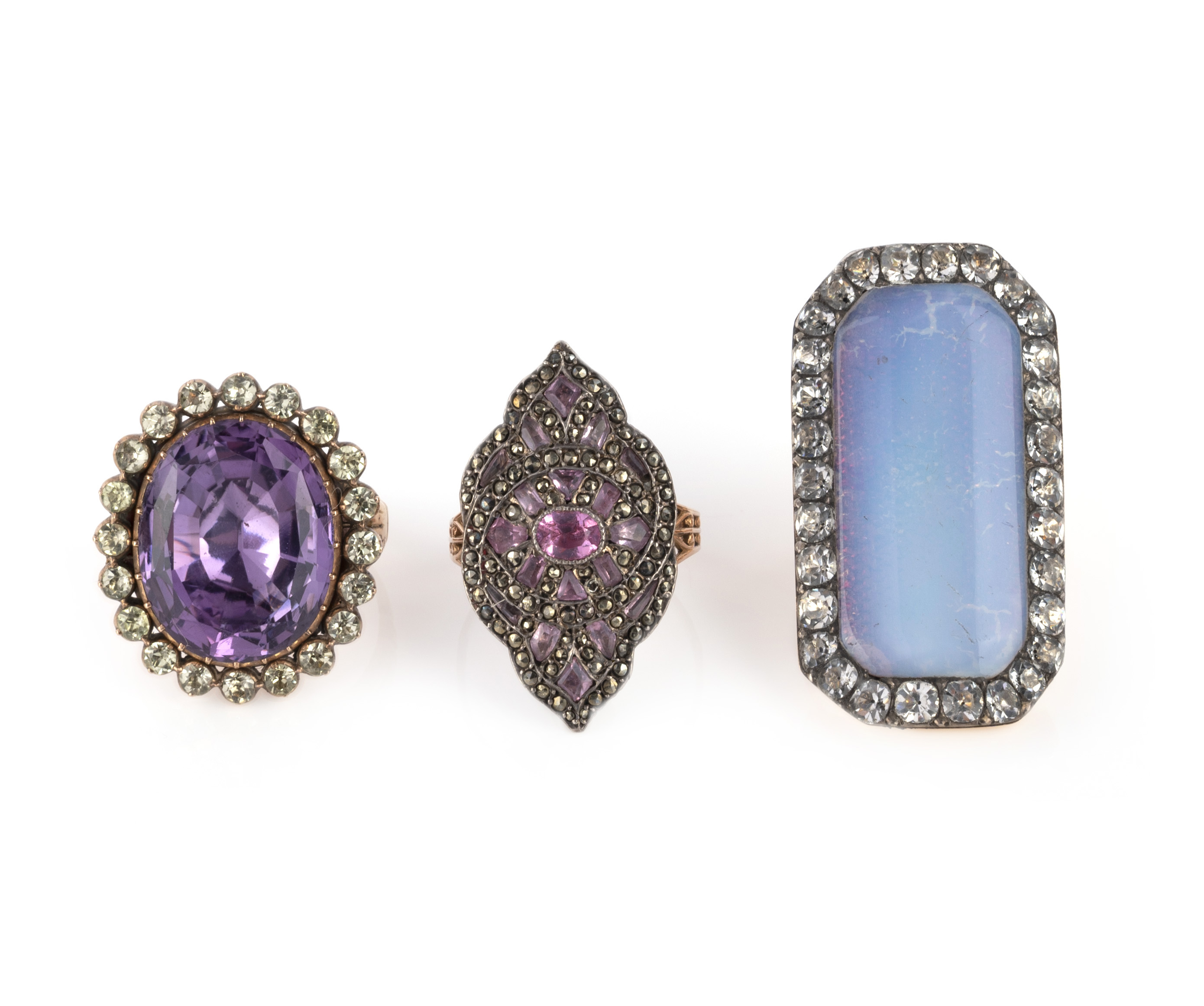 A collection of three rings, 19th century, comprising: a ring set with an oval amethyst within a border of circular-cut chrysoberyls, mounted in gold in closed-back settings, size O; an elongated plaque ring set with opaline glass over a patterned foil background, to a border of cushion-shaped colourless paste stones, mounted in gold, size O; and a ring of navette design set with variously cut pink topazes and rose-cut marcasites, mounted in silver and gold, size P1/2, indistinct assay mark