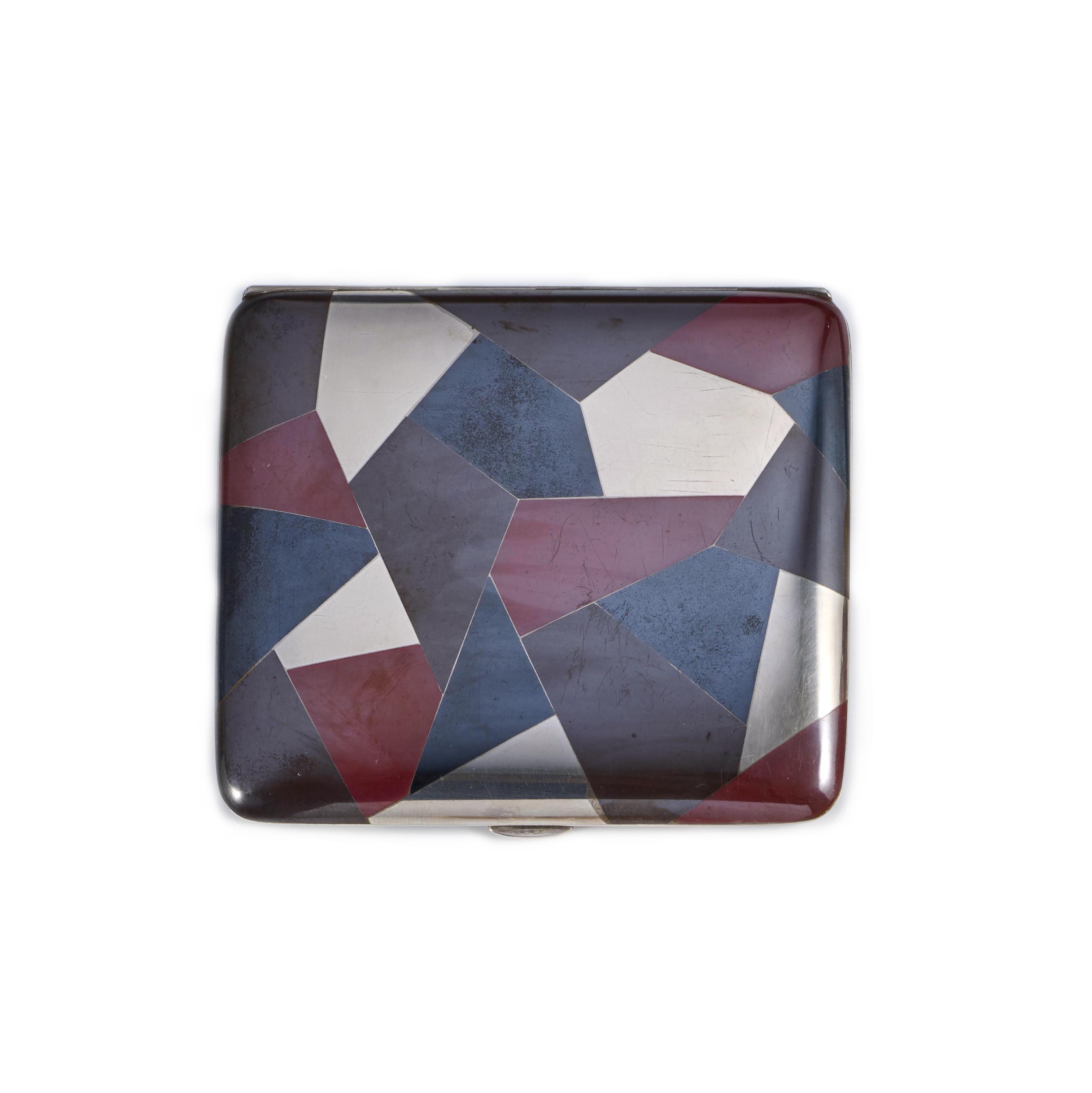 An Art Deco silver and enamel cigarette case, circa 1930, the hinged rectangular silver case applied with geometric designs in black, red and brown enamel, to the interior and exterior, measuring 8.1 x 7.3 x 0.8cm, unmarked