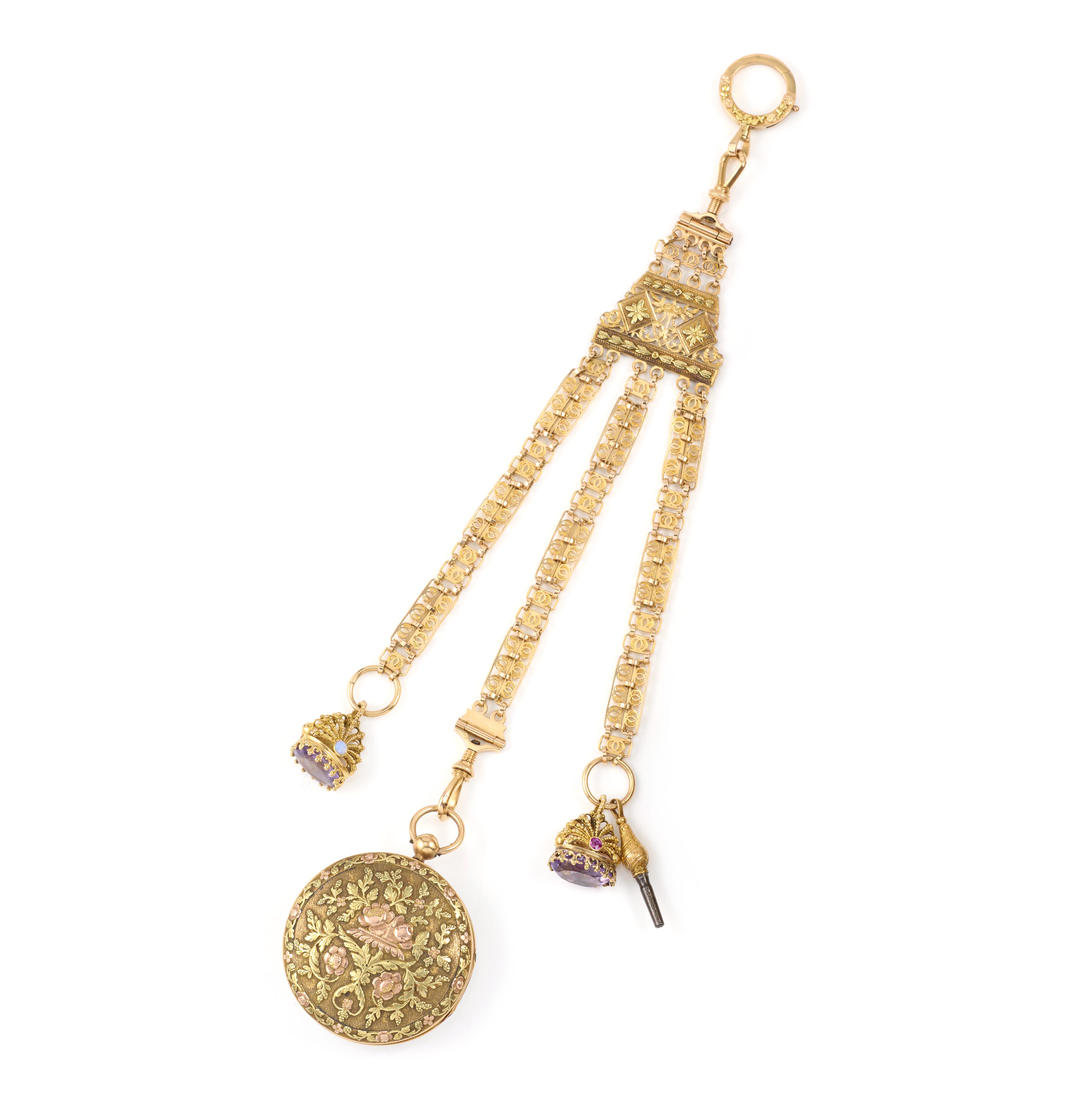 A fine gold chatelaine and pocket watch, France, 19th century, the chatelaine of intricate openwork design with floral decoration in three-coloured gold, splitting into three sections, chatelaine length 18cm, French assay marks for 18ct gold; suspending two amethyst fob seals in gold cannetille, accented with cabochons of opal and garnet, one garnet replaced with a circular ruby; a winding key, and a pocket watch, the white enamelled dial with Roman numeral indicators and winding key aperture, the case with floral designs in three-coloured gold, case width 4cm, interior numbered, pocket watch and fob seals of the period but possibly later added
