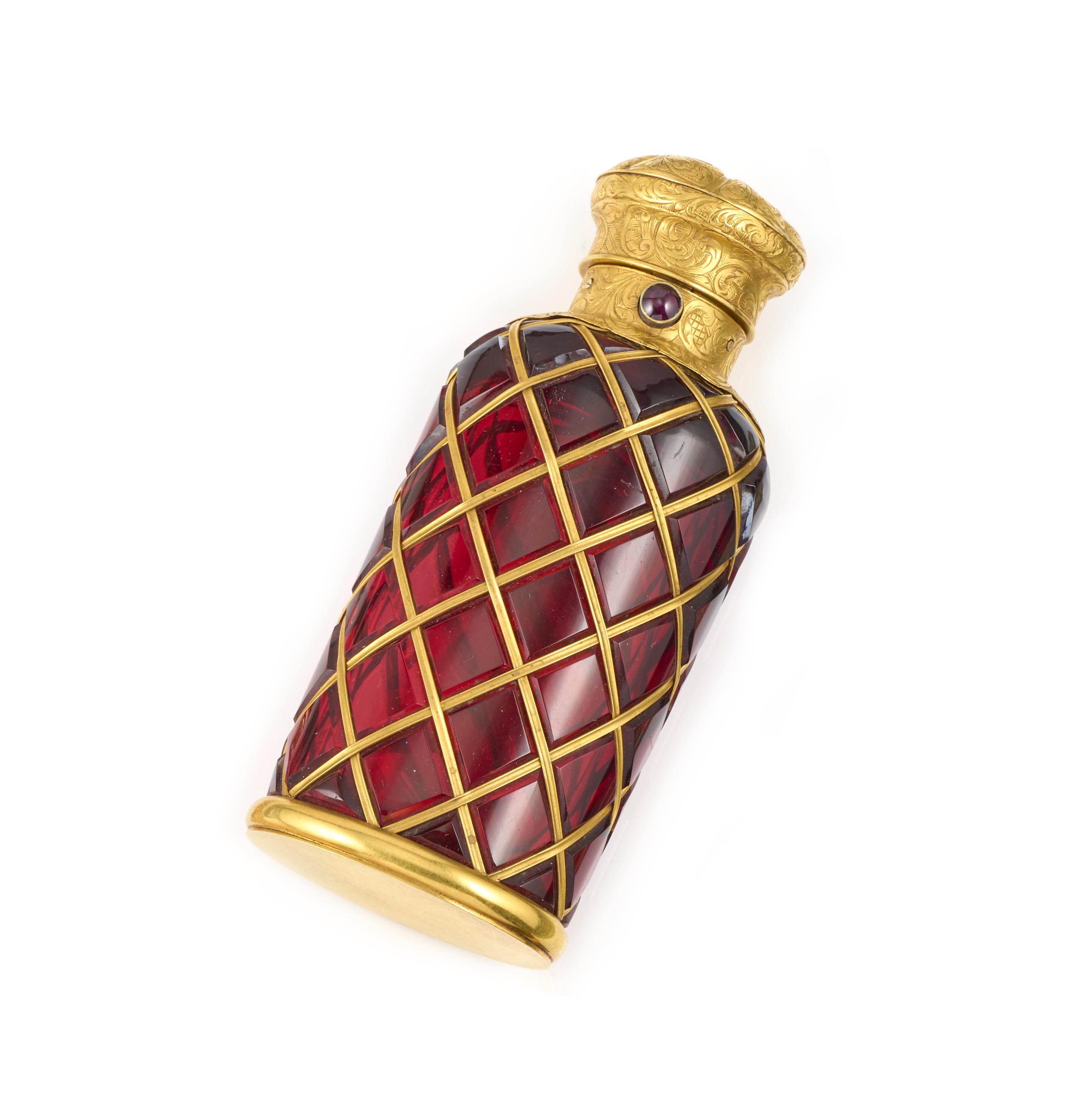 Retailed by Hunt & Roskell, a Victorian garnet, cranberry glass and gold scent bottle, 19th century, the deep pinkish-red glass bottle incised in a grid pattern encased with gold cagework, to a gold base and an engraved gold lid with cabochon garnet push piece, measuring 9.7 x 4.1 x 3.0cm, original fitted case stamped Hunt & Roskell, late Storr & Mortimer