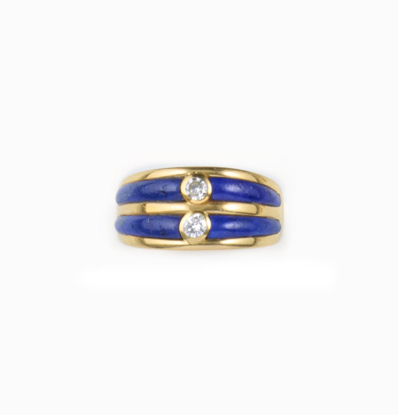 A lapis lazuli and diamond ring, France, 20th century, collet-set with brilliant-cut diamonds between two bands of polished lapis lazuli, mounted in gold, size U1/2, French assay mark for 18ct gold, French maker's mark PM with scales