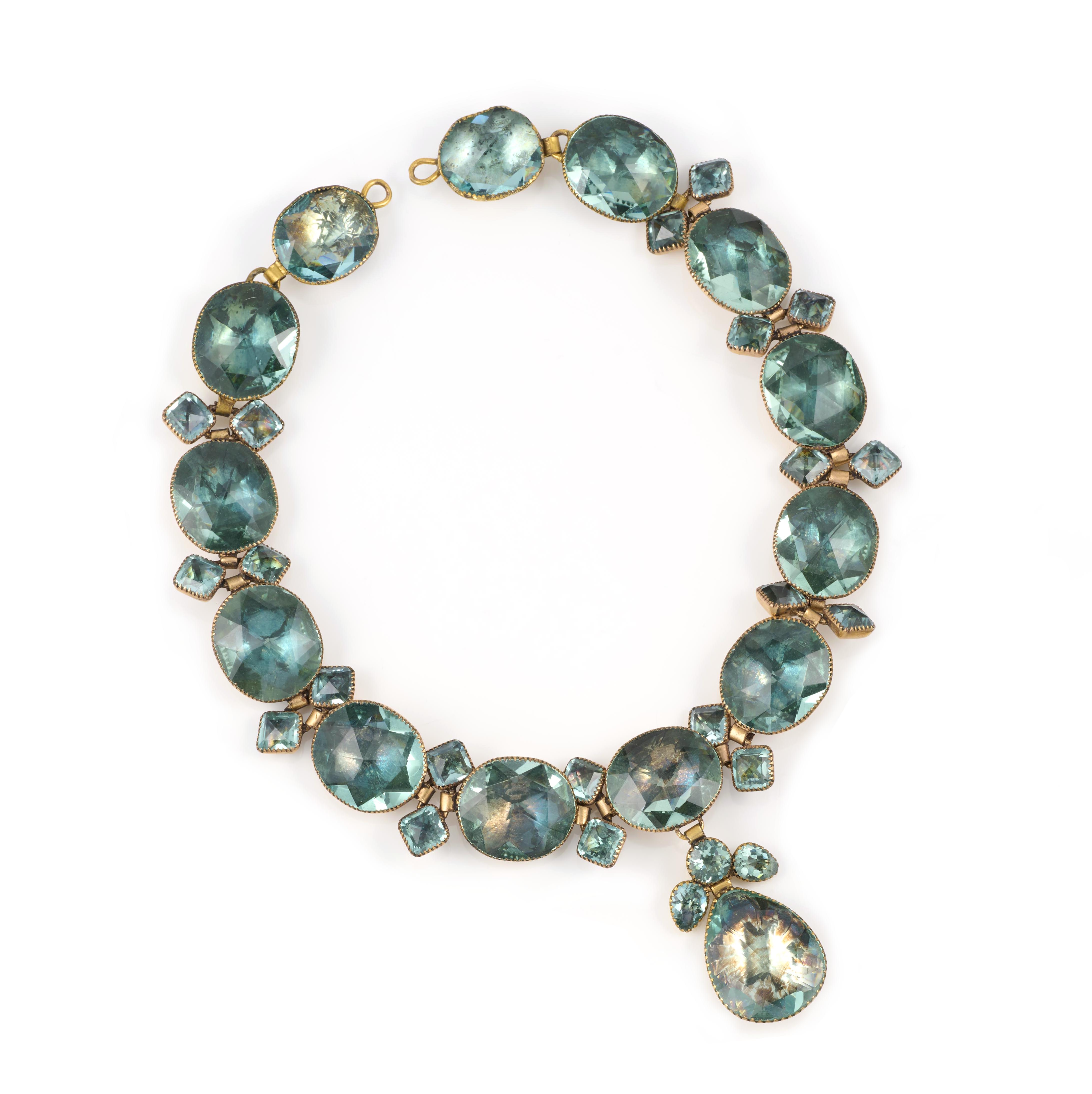 A rare 'Queen Anne' paste necklace, mid 18th century, composed of oval rose-cut and square-shaped pale blue 'aquamarine' pastes in foiled gilt metal settings, suspending a similar pear-shaped pendant, the back with hoop fittings intended for a ribbon, length 37cm, length at front 5.8cm