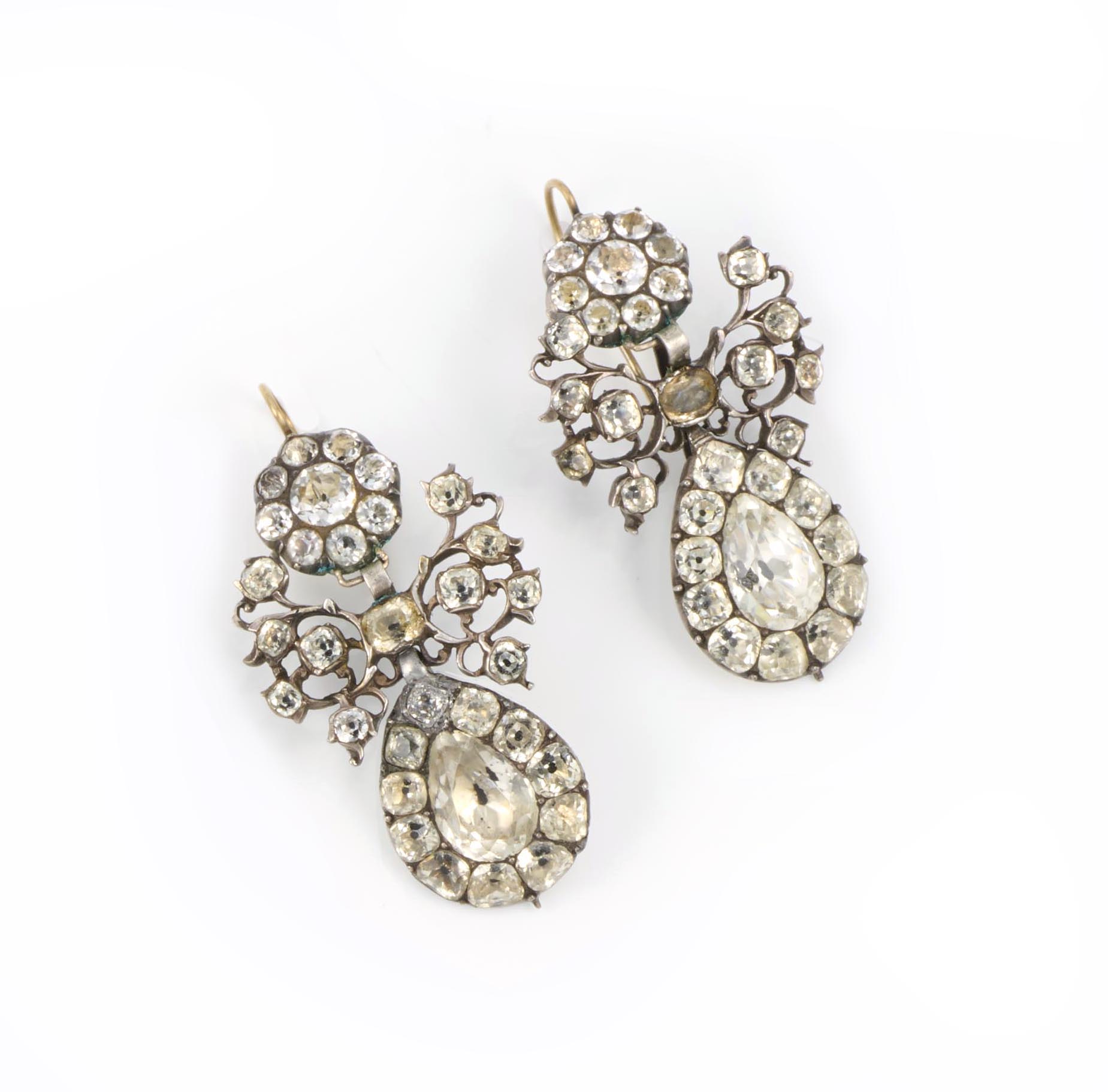 A pair of paste earrings, 18th century, each composed of a circular-cut paste cluster suspending a similar pear-shaped drop, divided by a section of foliate scrolls set with cushion-shaped pastes, each mounted in silver in closed-back settings, length 4.7cm each, drops and central sections detachable, later hook fittings