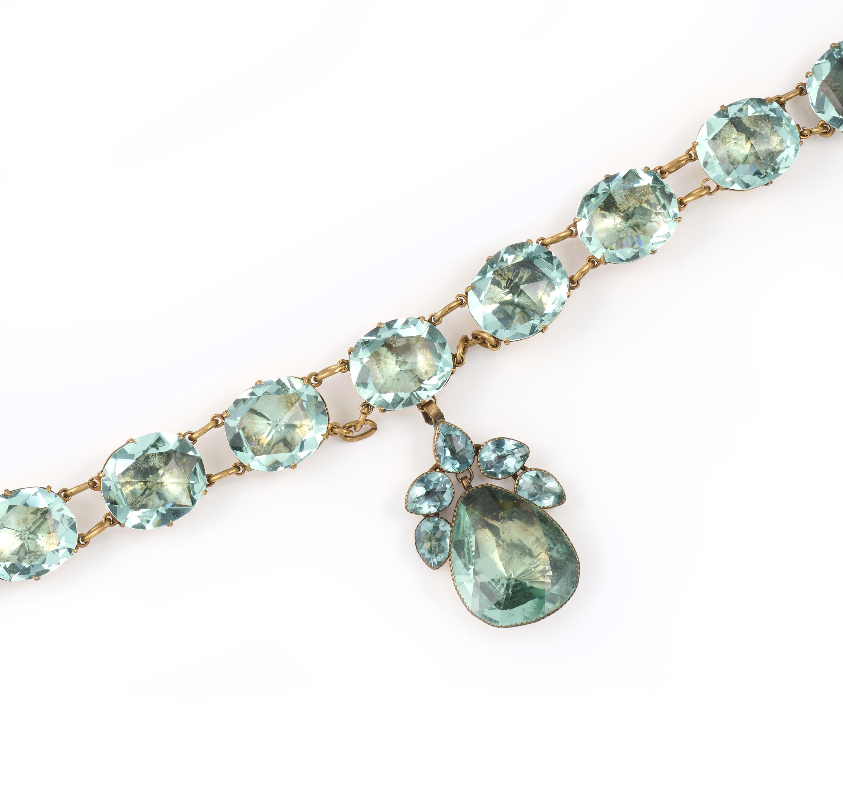 A rare 'Queen Anne' paste necklace, mid 18th century, composed of oval rose-cut pale blue 'aquamarine' pastes, claw-set in foiled gilt metal settings, suspending a similar pear-shaped pendant, connected by gilt metal chain links, the back with hoop fittings intended for a ribbon, length 26cm, length at front 6cm