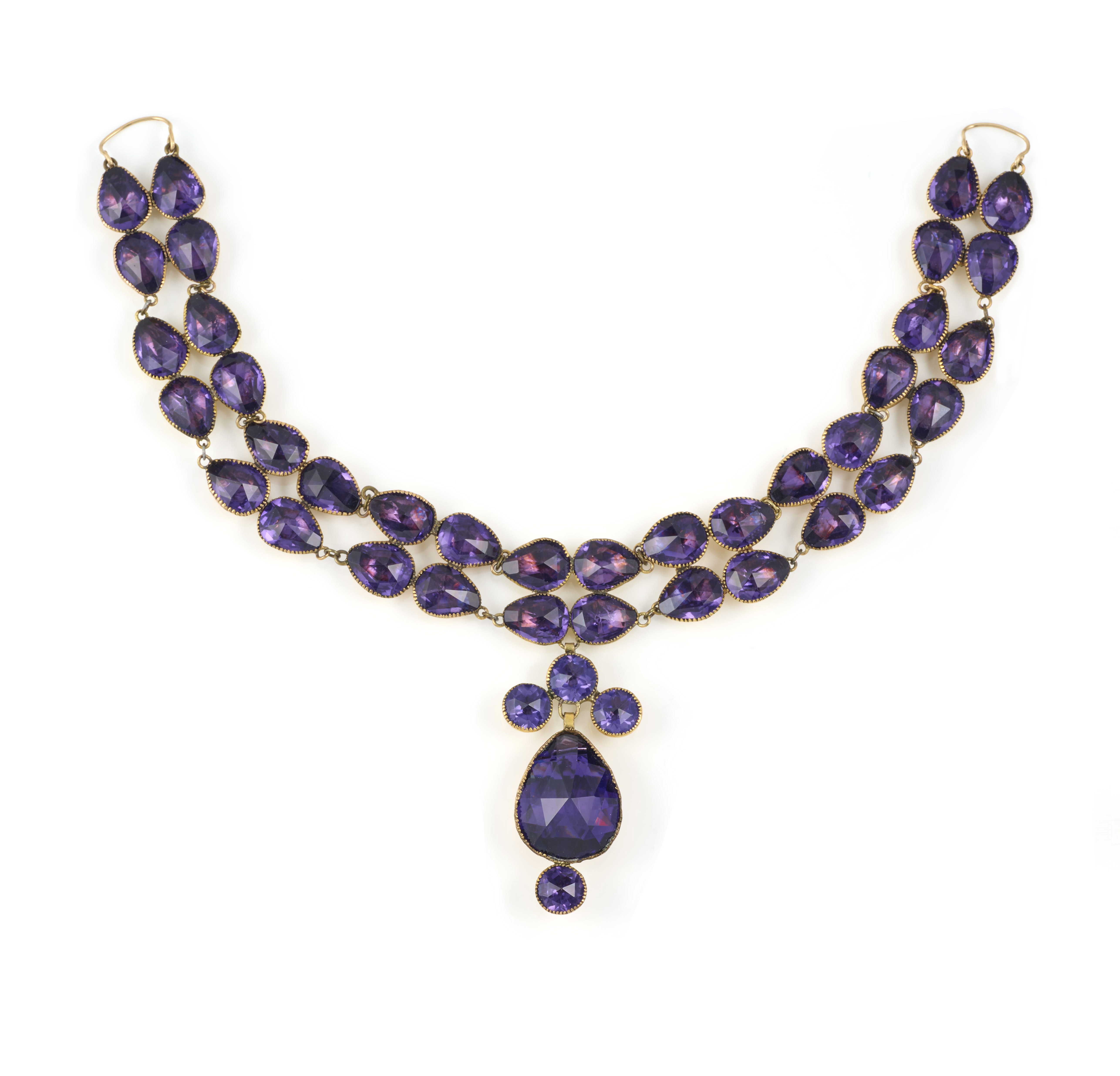 A rare 'Queen Anne' paste necklace, composed of pairs of pear-shaped violet pastes, suspending a similar pendant set with circular-cut and pear-shaped pastes, in foiled gilt settings, each end culminating in a hoop intended for ribbon, length 31cm, length at front 7.7cm