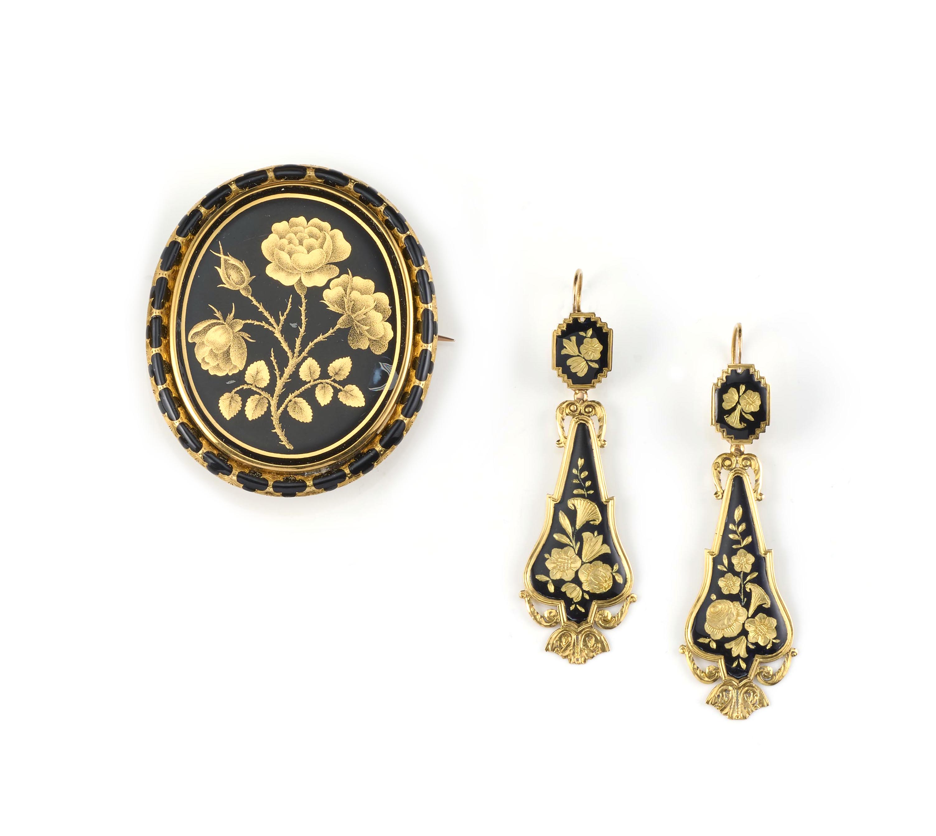 A verre églomisé brooch and a pair of enamel earrings, 19th century, the brooch of oval outline, the centre with a glazed panel depicting a gold verre églomisé spray of roses, within a gold frame applied with quatrefoils of black enamel, measuring 4.2 x 4.9cm; together with a pair of gold drop earrings applied with black enamel, with engraved sprays of roses, anemones, lilies and convolvulus in reserve, length 6cm each, French assay marks for gold, Paris, 1819-38, fitted case