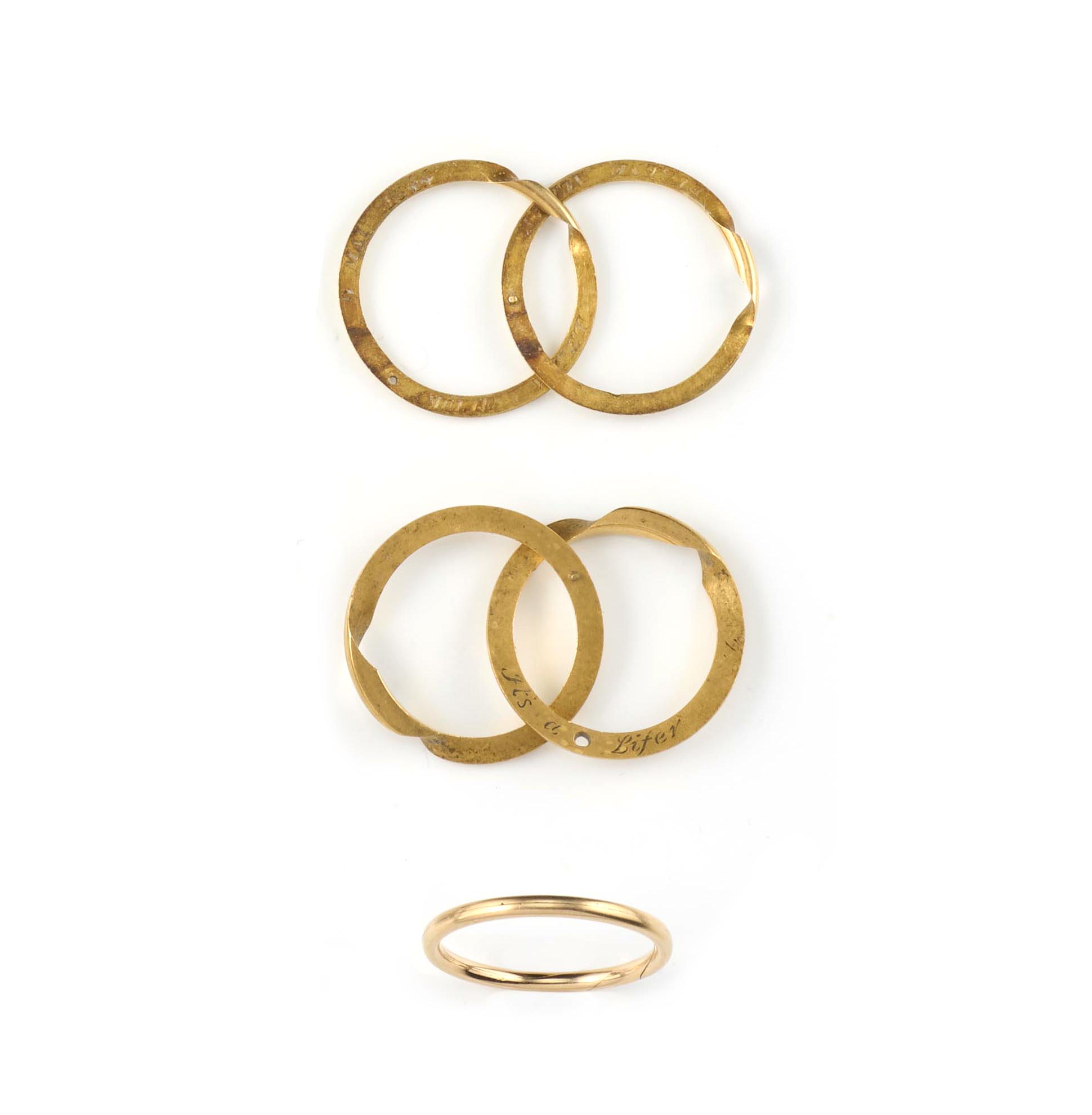 A collection of three gold gimmel rings, 19th century, each splitting into two conjoined rings, two with inscriptions, reading 'It's a lifer' and 'EUGENE AUBRY, AMELIE VITET 1844', respectively, sizes K1/2 to N