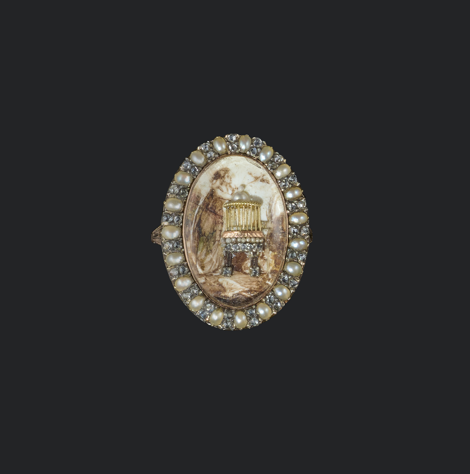 λ An ivory, pearl and diamond mourning ring, late 18th century, of oval outline, centring on a glazed compartment set with an oval ivory miniature painted in sepia tones to depict a woman, leaning against a three-dimensional birdcage constructed from gold wire, set with rose-cut diamonds and a seed pearl, to an outer border of seed pearls and rose-cut diamonds, mounted in gold, size P, front measuring 2.5 x 1.4cm, later Dutch import duty mark, fitted case, pearls untested