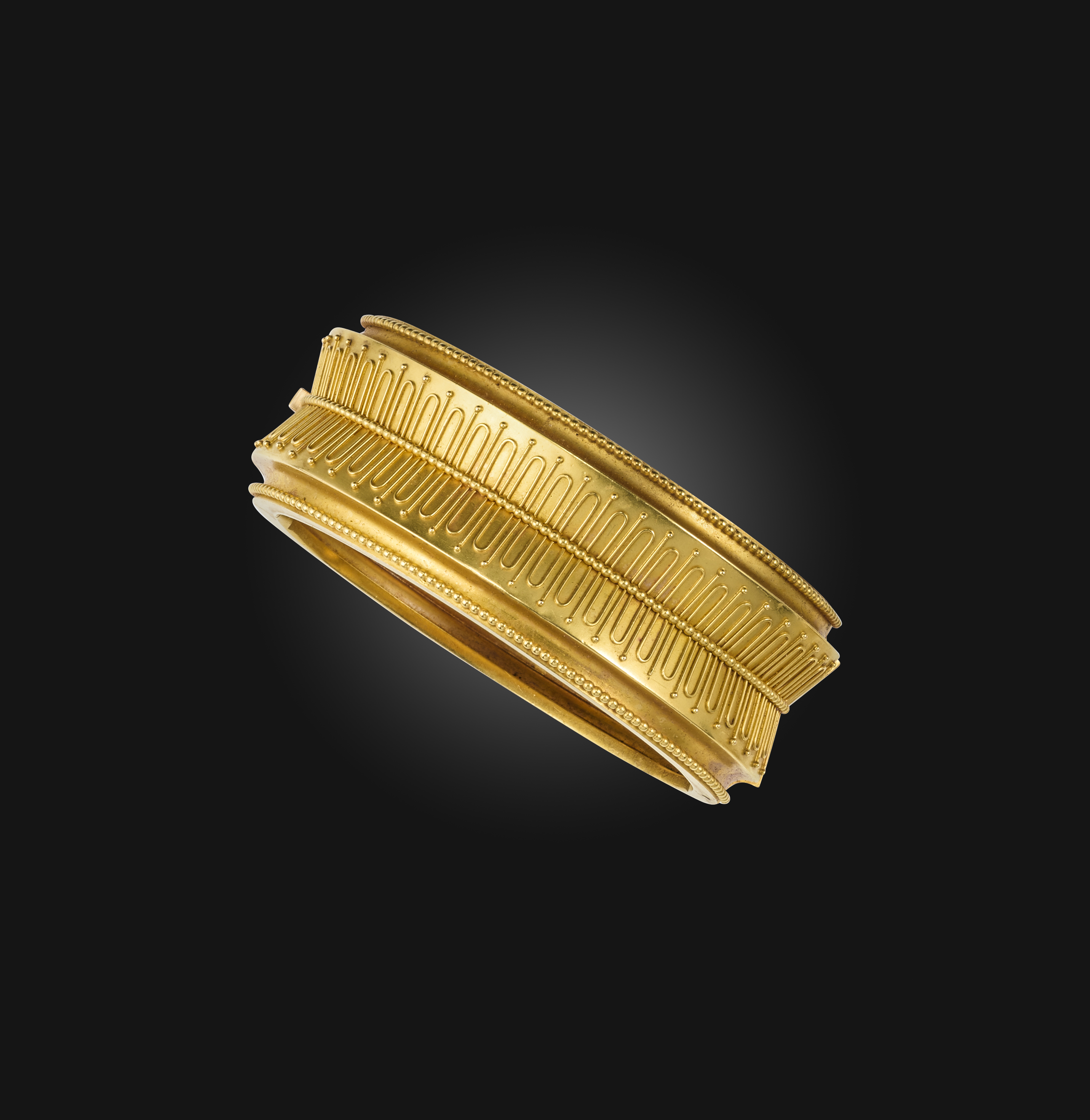 A Victorian gold bangle, late 19th century, of hinged construction, designed in the Archaeological Revival style, the front decorated with gold wire and bead work, inner circumference 16.6cm, gross weight 46 grams, fitted case stamped West & Son, Dublin
