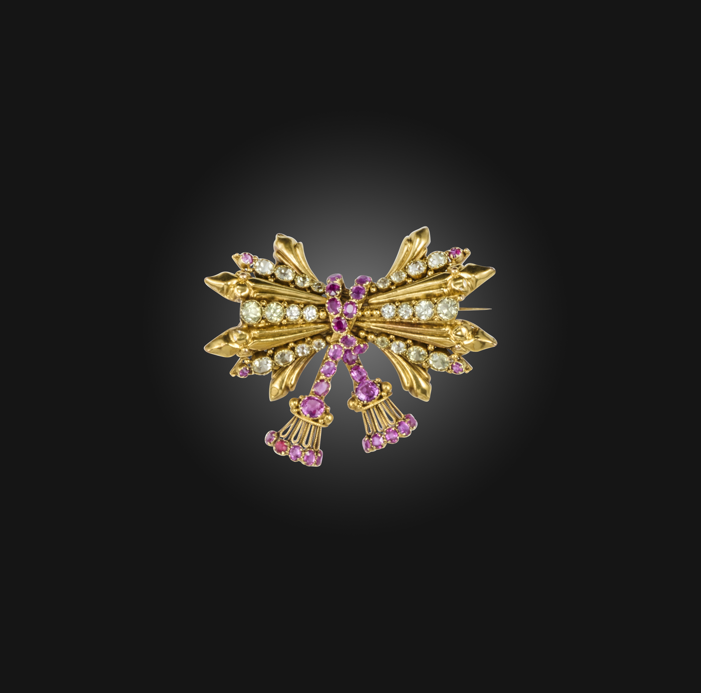 A ruby and chrysoberyl brooch, mid 19th century, designed as a trophy bound by rope, set with circular-cut rubies and chrysoberyls, mounted in gold, length 4.4cm