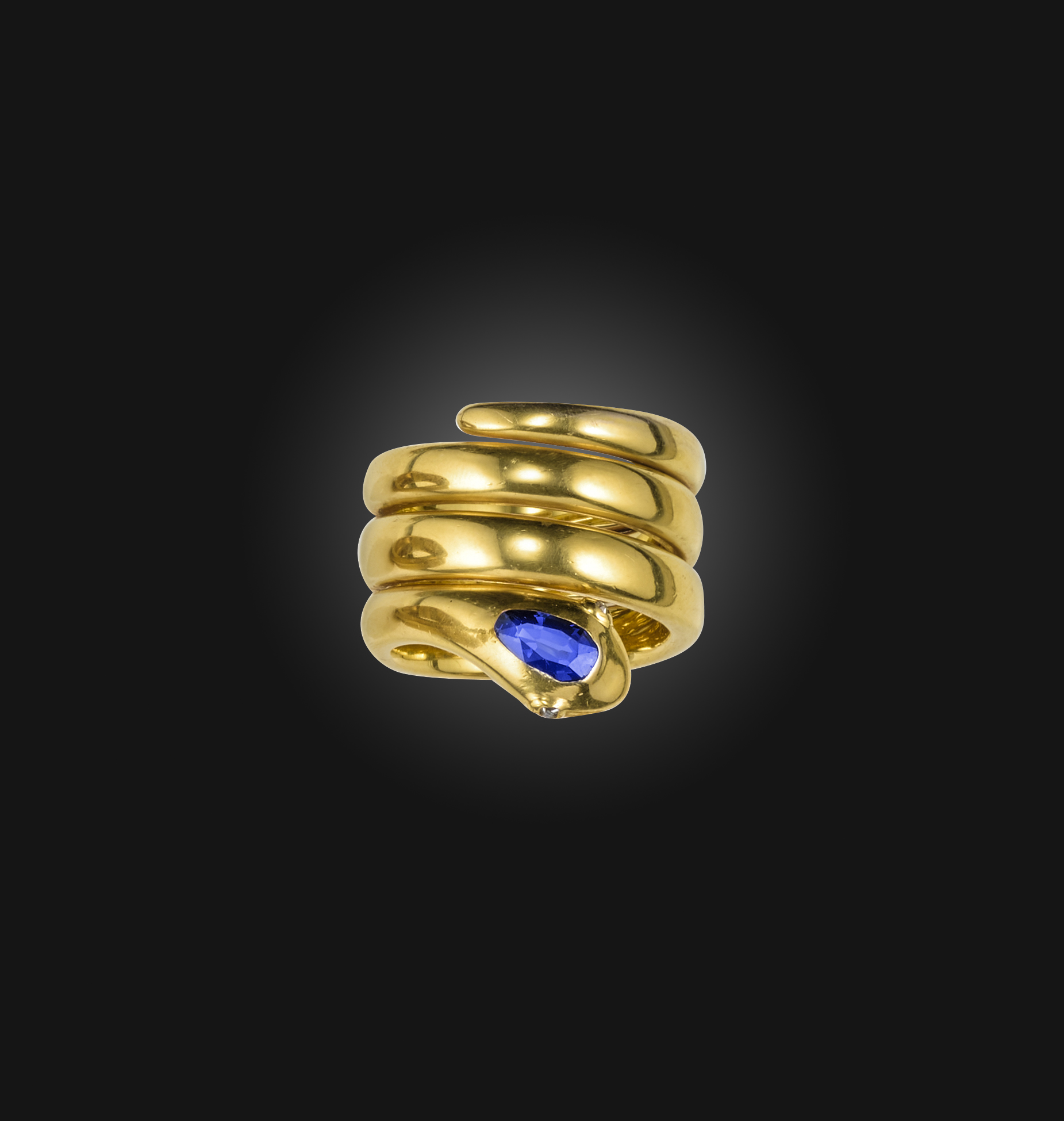 A sapphire and diamond ring, mid 19th century, designed as a coiled snake in gold, its head set with a pear-shaped sapphire, its eyes set with rose-cut diamonds, size V1/2