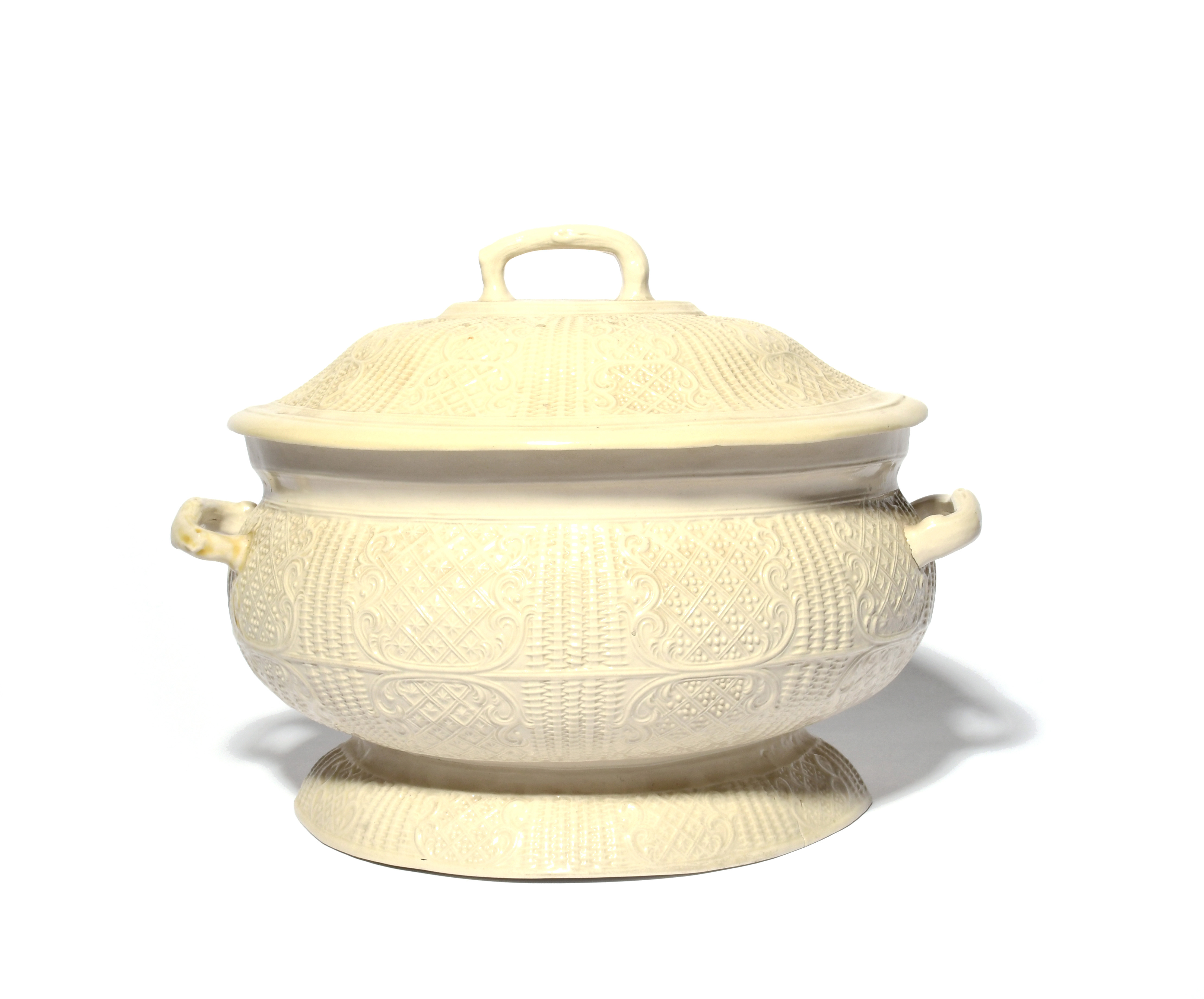 A large salt-glazed stoneware tureen and cover, c.1760-70, the oval form crisply moulded with varying diaper panels on a basketweave ground, some faults, 33cm across.