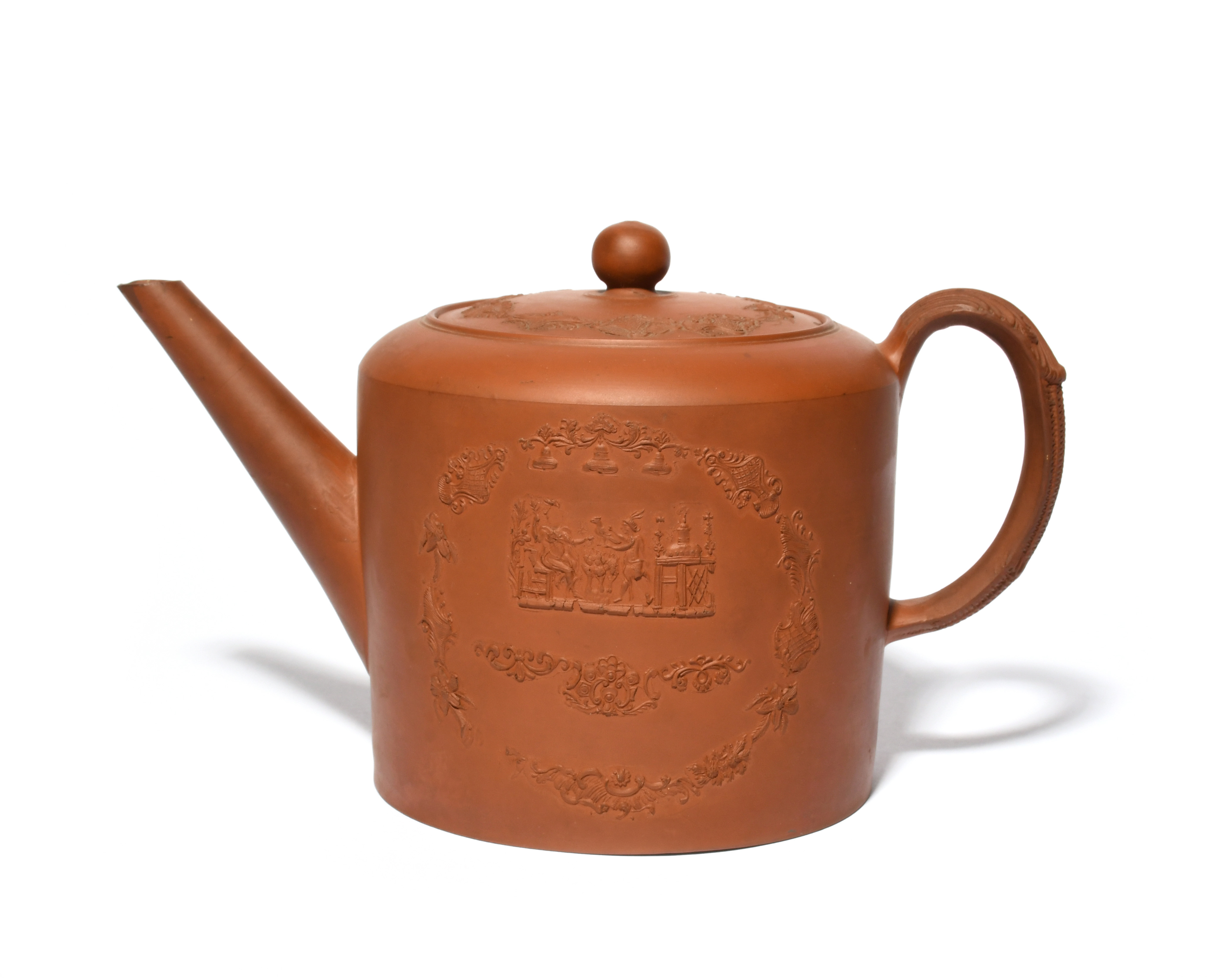 A large Staffordshire redware teapot or punch pot and cover, c.1760, the cylindrical form sprigged with figures at various pursuits with birds and objects, between formal foliate and trellis designs, some chipping to the edge of the cover and spout, 7.5cm across. (2)