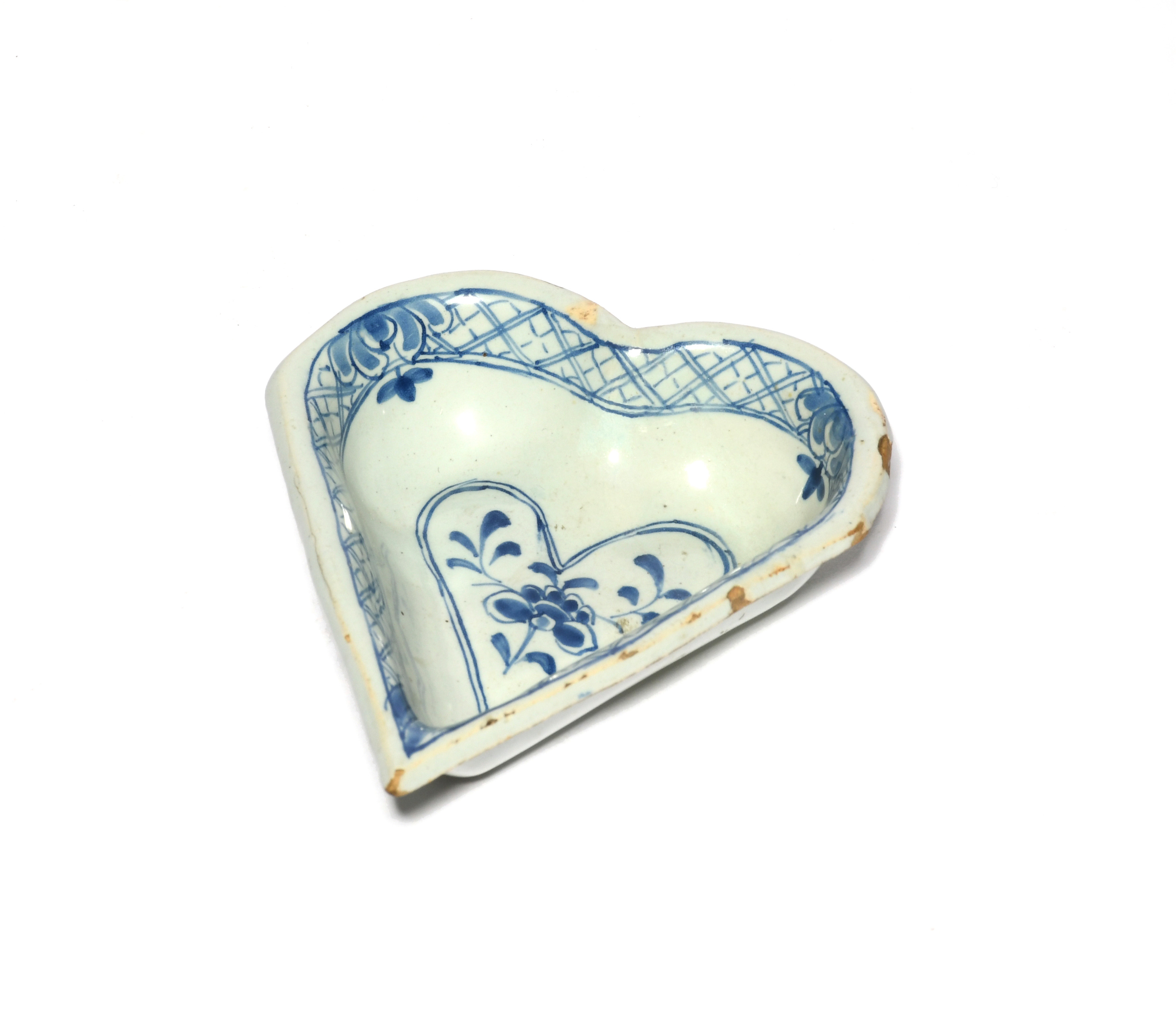 A delftware sweetmeat or hors d'oeuvres dish, c.1750, probably Liverpool, of heart shape, painted in blue with a central peony spray within a trellis border, some good restoration, 12cm.