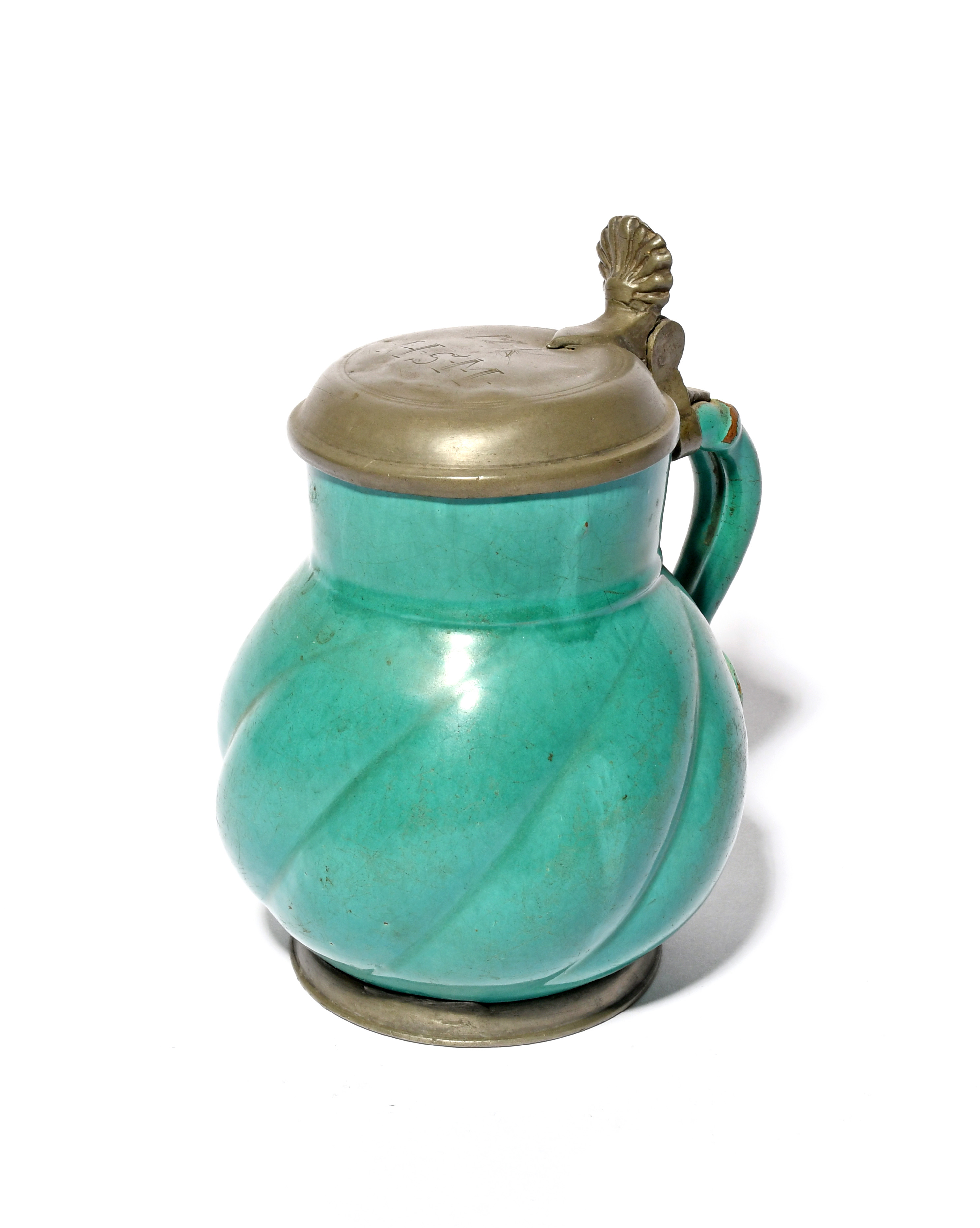 A German faïence jug, 18th century, the squat spiral-moulded body decorated in a rich turquoise glaze, with a pewter mount to the foot and a hinged pewter cover inscribed 'MR' and 'HSM', 16.8cm high.