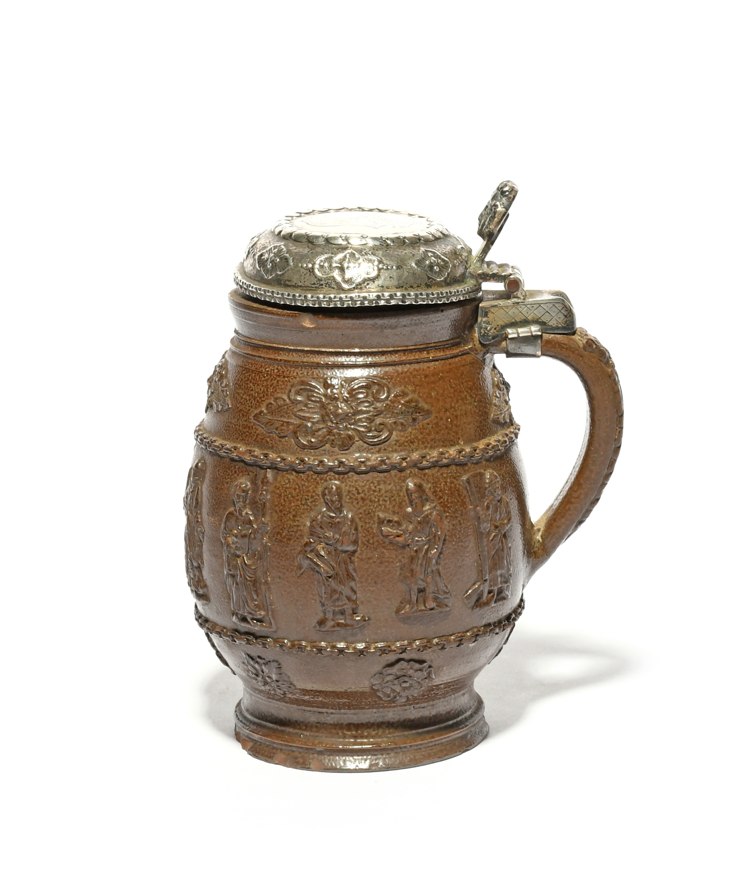 A silver-mounted German stoneware beer stein or jug, probably 19th century in the late 16th century Raeren manner, the ovoid body applied with ten figures representing most of the Apostles, the silver mount engraved with the arms of the Kingdom of Prussia, 18.3cm.