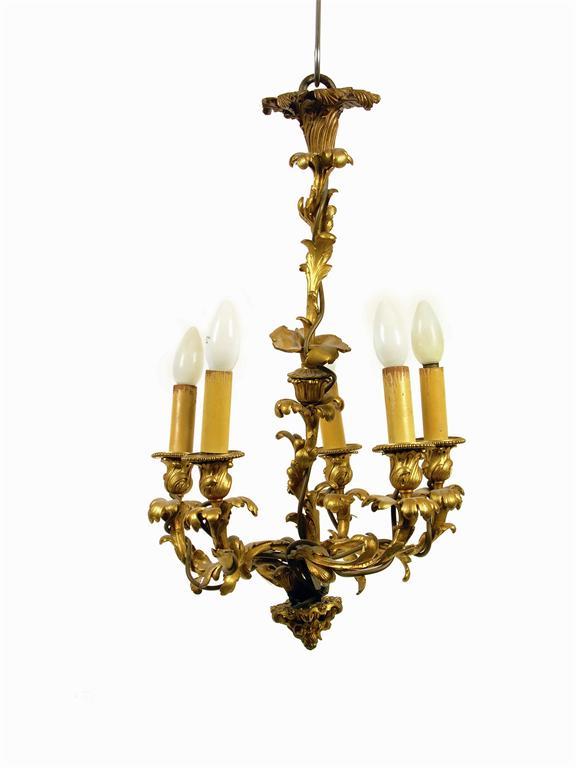 A gilt brass five light candelier, of scrolling leaf design, later drilled for electricity, 23.25in (59cm) h, 14.25in (36cm) w.