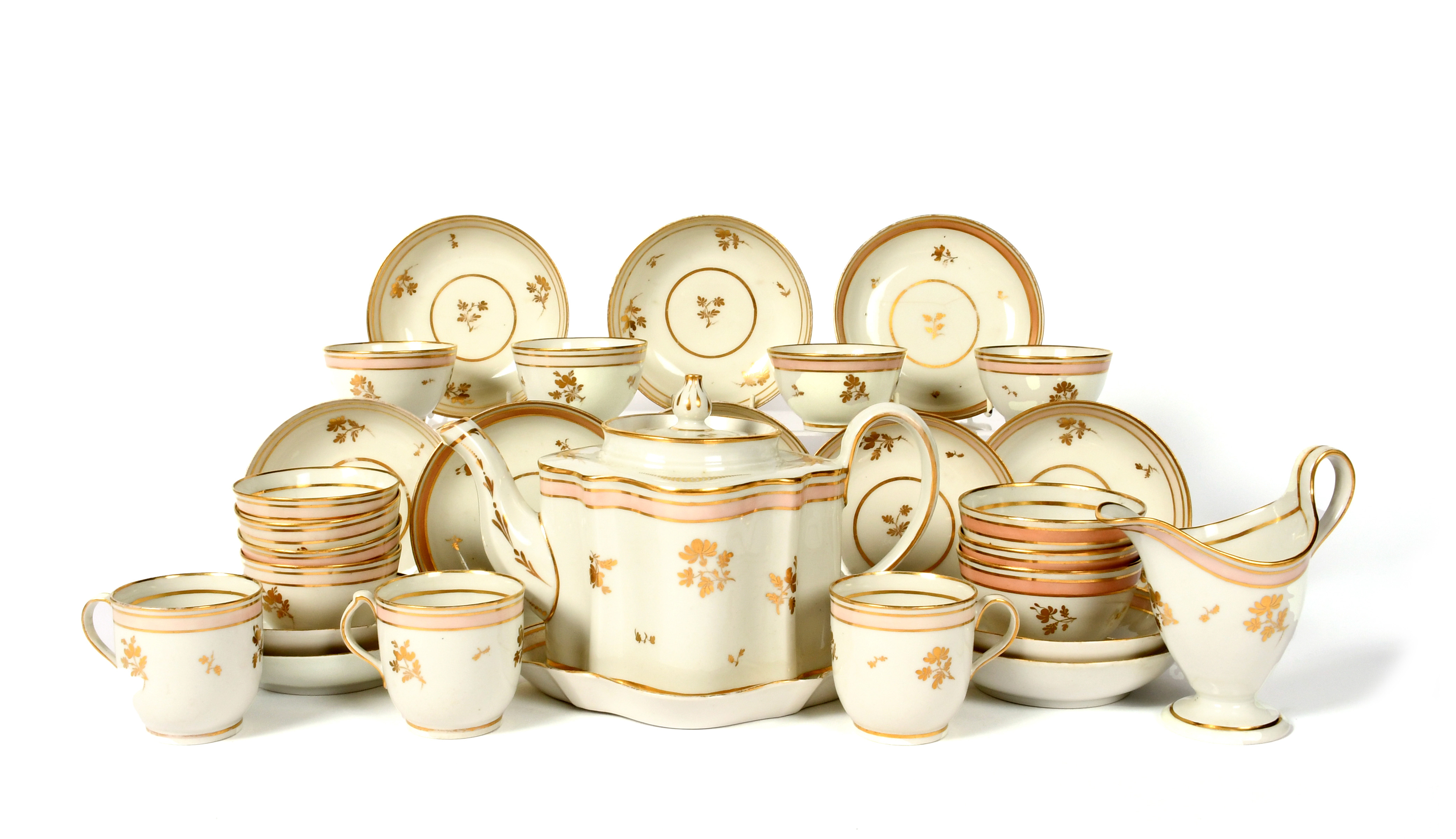 A New Hall part tea service, c.1800, decorated in pattern 167 with narrow pink bands above gilt flower sprigs. Comprising: a teapot with cover and stand, a milk jug, eleven teabowls, three coffee cups and twelve saucers. (30)
