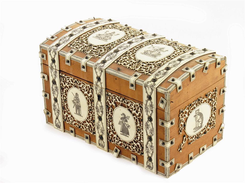 A 19th century Anglo-Indian tea caddy, Vizagapatam, sandalwood with pierced and lac decorated ivory mounts, the hinged domed cover and sides with oval panels of figures, a cat and a monkey, the interior with a similar panel depicting a building and inscribed 'In Memory of the christening at Kylassa 28th Oct 1879,' to a pair of lids with horn grounds and turned ivory handles and lead lined, 6in (15cm) h, 10in (25.5cm) w, 5.5in (14cm) d.