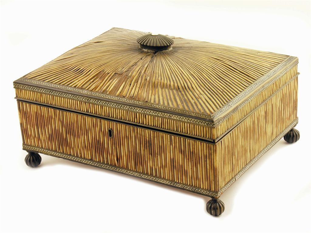 A 19th century Anglo Indian work box, Vizagapatam, of sandalwood with porcupine quills, lac decorated ivory and horn, the hinged lid with a hinged door, to a lift out tray with lidded compartments, a horn tape measure holder and a thimble, on ribbed horn feet, 7.5in (19cm) h, 12.75in (32.5cm) w, 9.75in (24.5cm) d.
