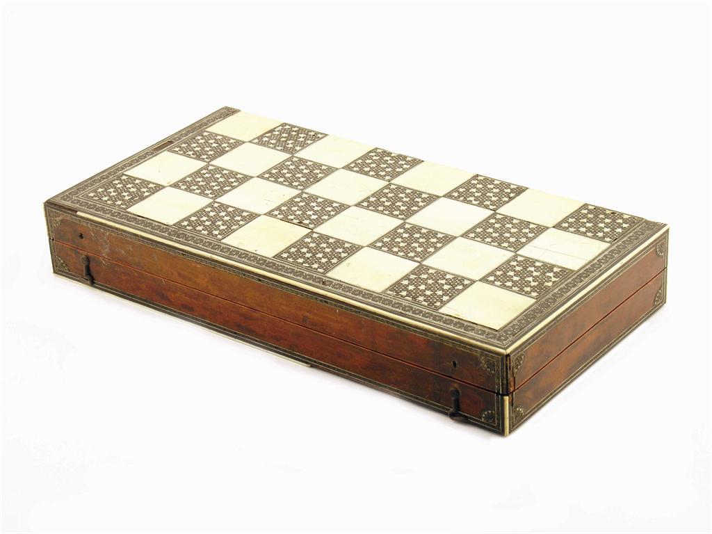 An Anglo Indian folding games box, sandalwood and sadeli, the exterior inlaid for chess and the interior for backgammon, 17 x 8.5in (43 x 21.5cm) closed, together with a pair of turned boxwood dice shakers and turned natural and red stained ivory counters, cracks, one broken and two reds missing.