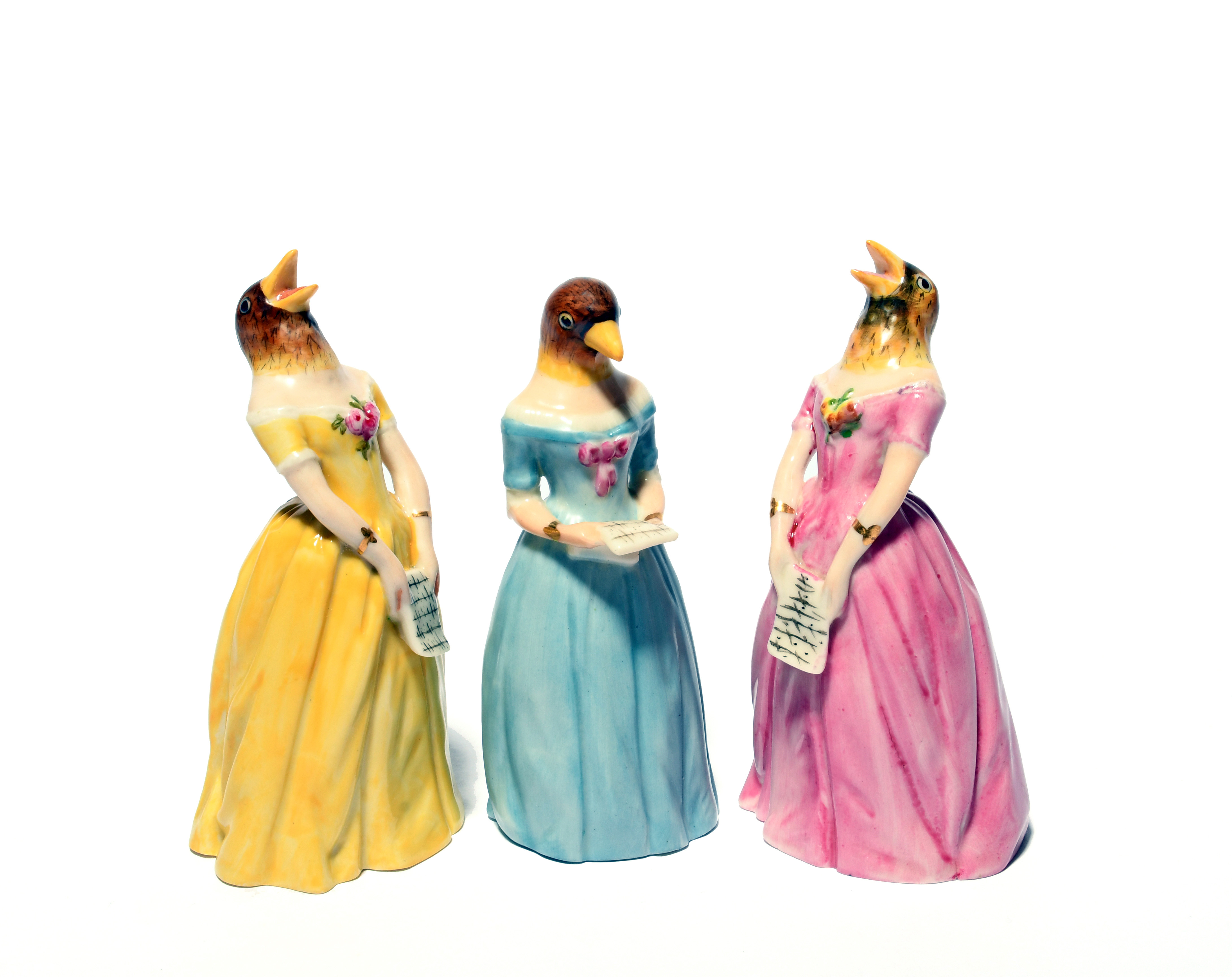 Three Royal Worcester candle snuffers, date codes for 1924 and 1925, of Confidence and Diffidence, depicting the singer Jenny Lind as a nightingale, alternately dressed in a yellow, pink or blue gown and holding a sheet of music, printed marks, 11cm.