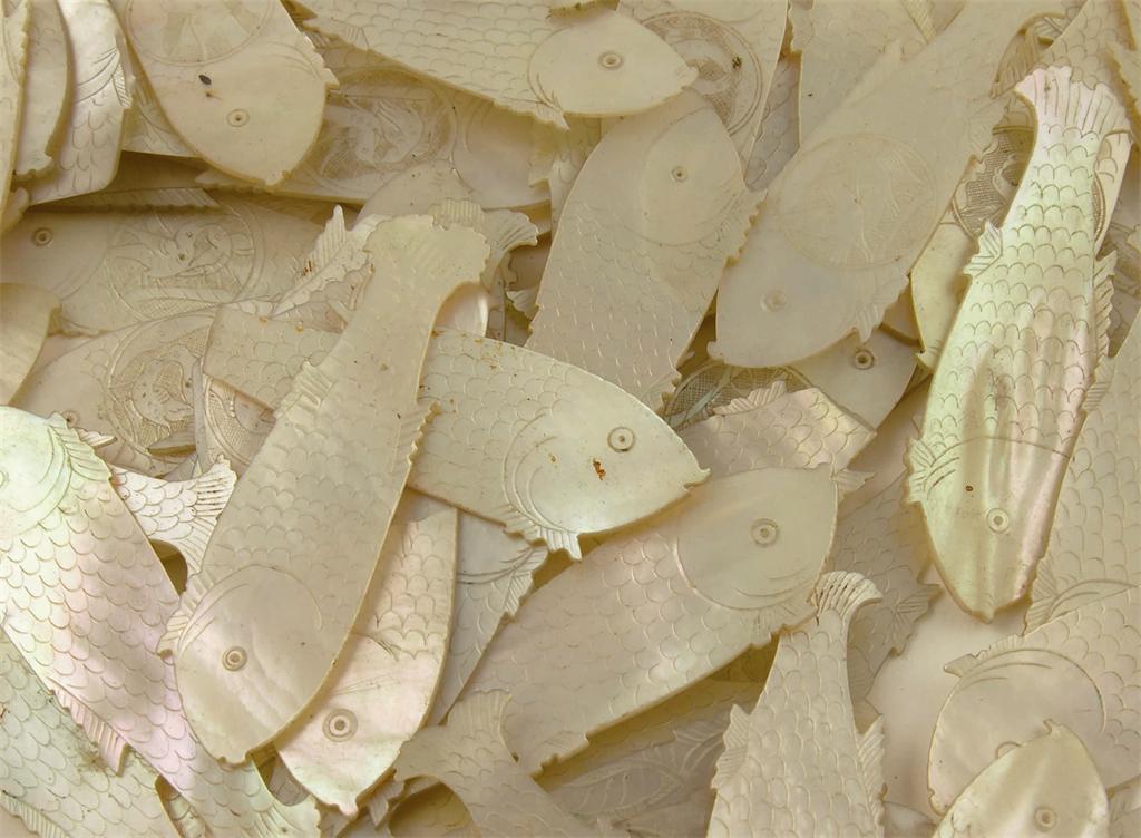 Chinese mother of pearl counters, modelled and engraved as fish, with double bird crest, 50 complete and 18 part.