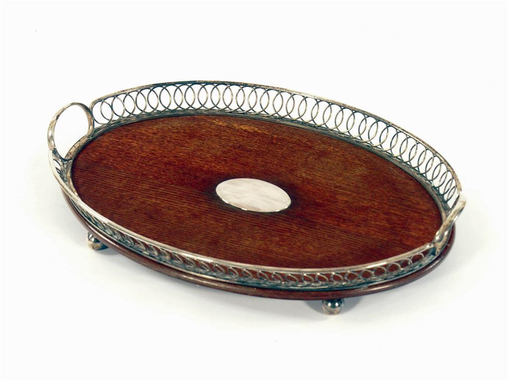 An oval oak tray, with a plated open ring gallery on ball feet, the centre with a vacant plaque, 20in (51cm) w.