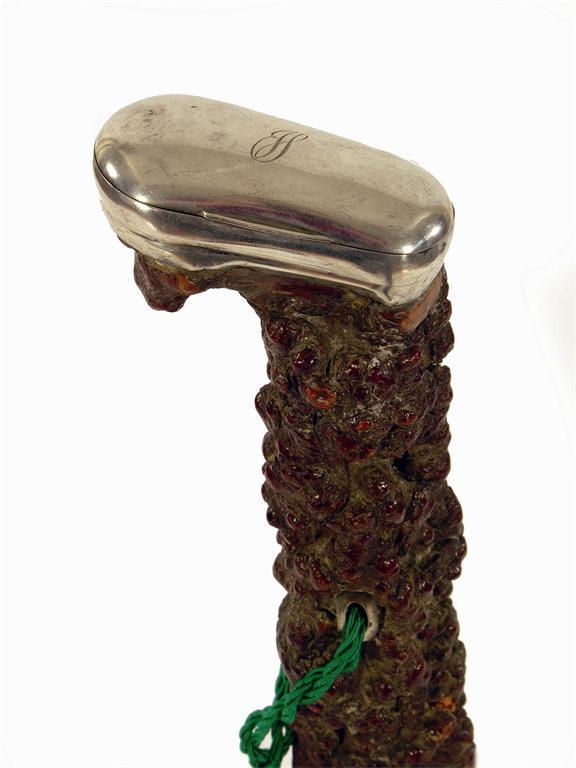 A Regency burr wood snuff walking stick, the tapering oblong silver snuff box handle with a hinged cover, engraved initials and gild lined, by I R, London 1817, 25.5in (90cm) h.
