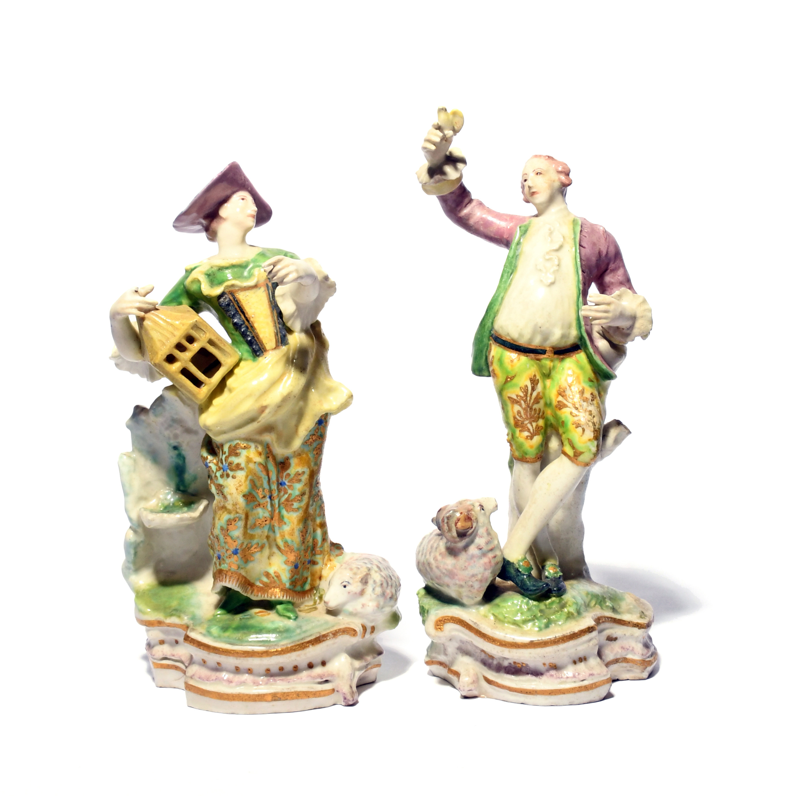 An early pair of Bow figures of Liberty and Matrimony c.1750-52, modelled as a gentleman holding a small bird aloft in his right hand, his companion holding a bird cage on one hip, each with a recumbent sheep beside them and raised on scrolled bases, some damages and restoration, probably later-decorated, 26cm. (2)