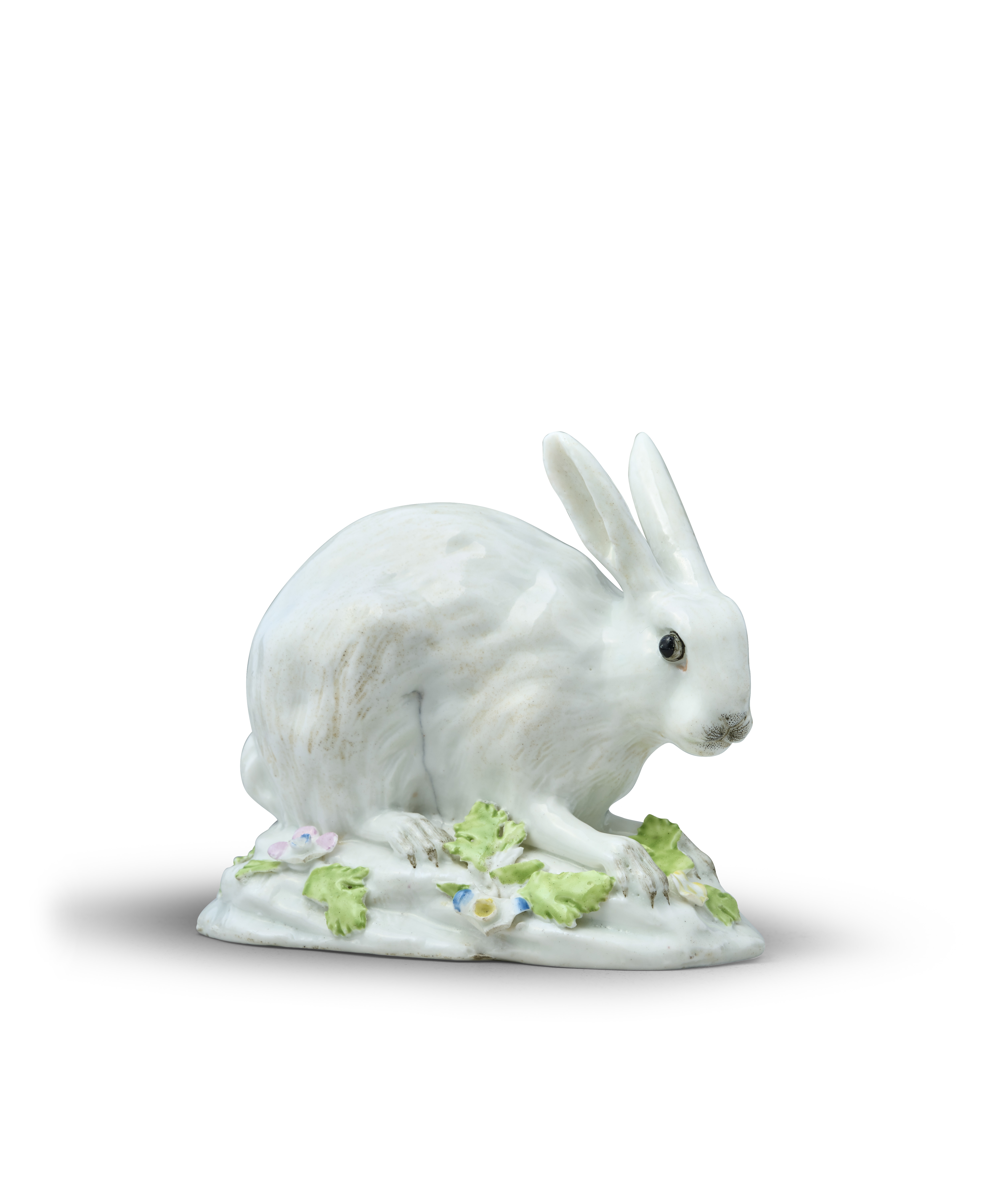 A rare Chelsea figure of a leveret, c.1755, after the Meissen models by J J Kändler, crouched on all