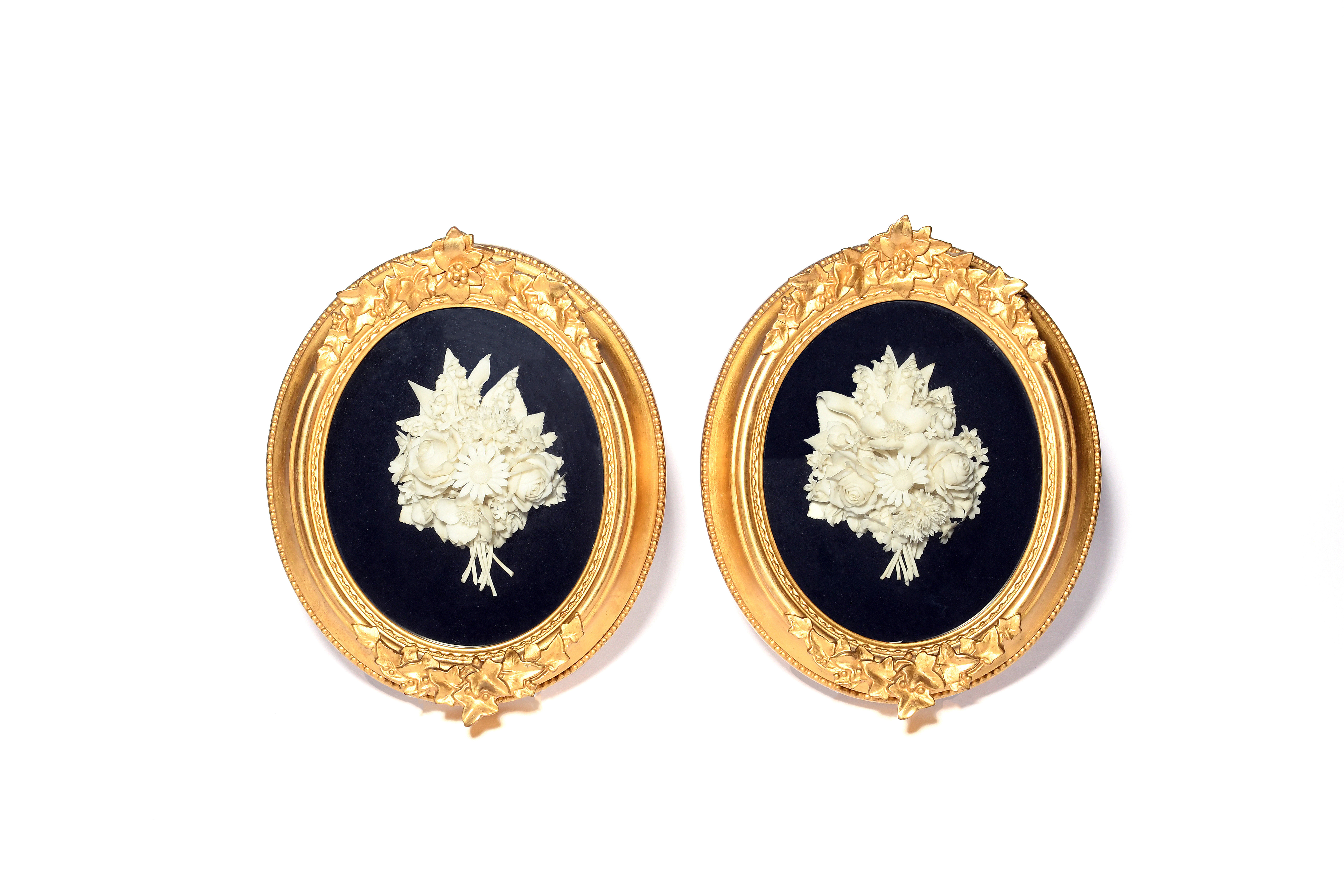 A pair of biscuit porcelain flower posies, 19th century, finely detailed with a variety of blooms, mounted on black velvet bases within deep glazed giltwood frames, 30.2cm overall. (2)
