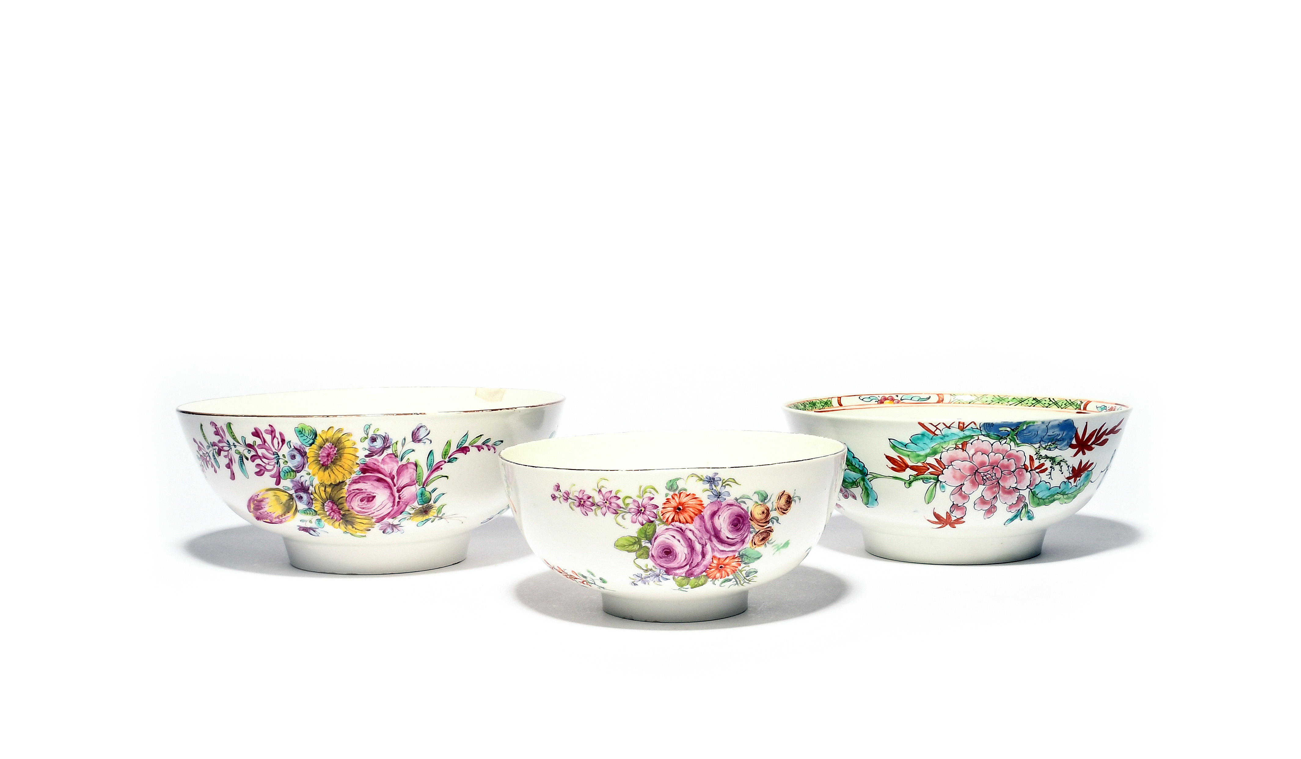 Three English porcelain punch bowls, c.1756-60, one Chelsea and painted with back-to-back roses and