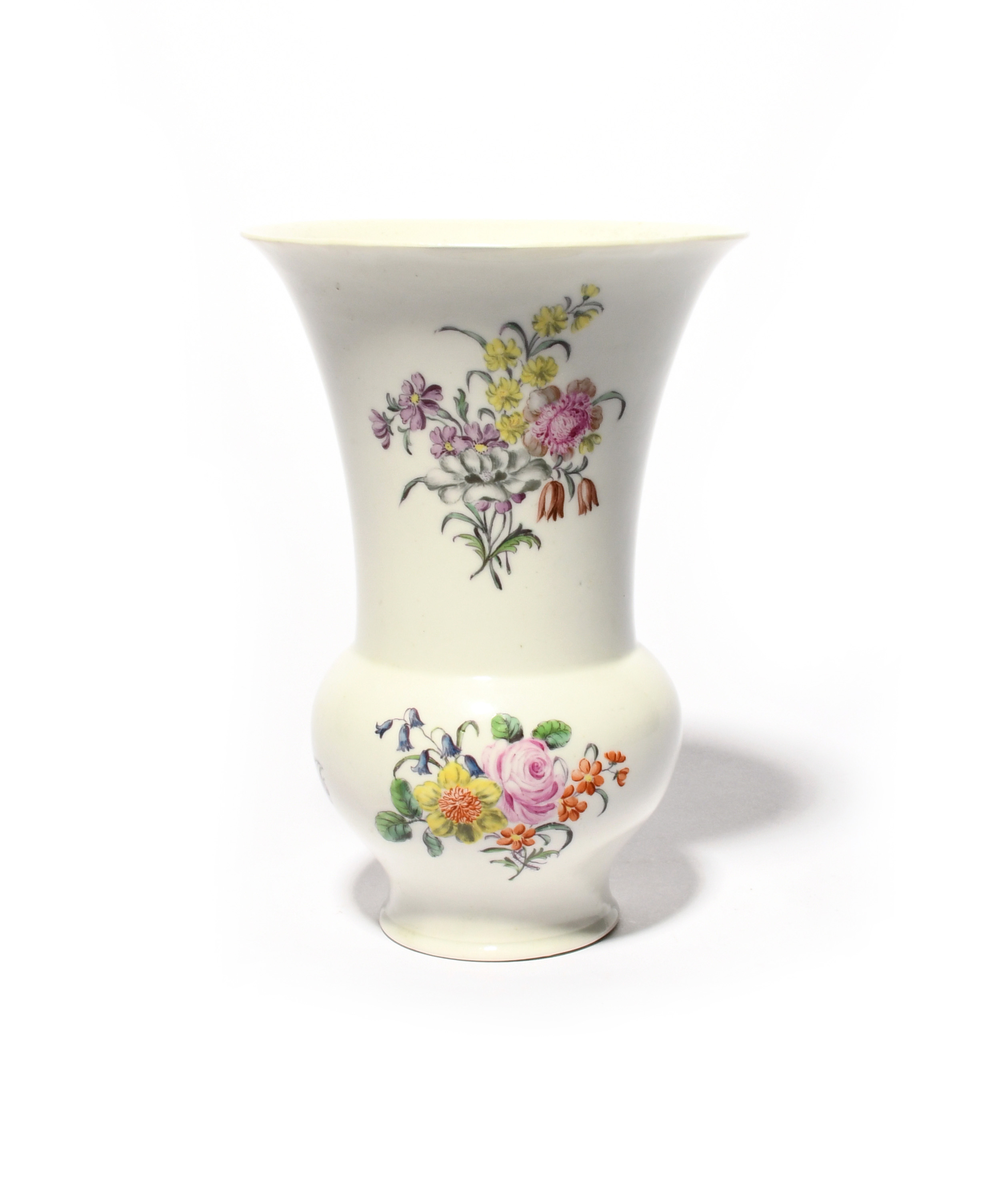 A rare Worcester beaker vase, c.1758, after Meissen, the generous flared neck rising from a squat baluster body, finely painted with flower arrangements and scattered sprigs, a little restoration to the rim, 16cm.