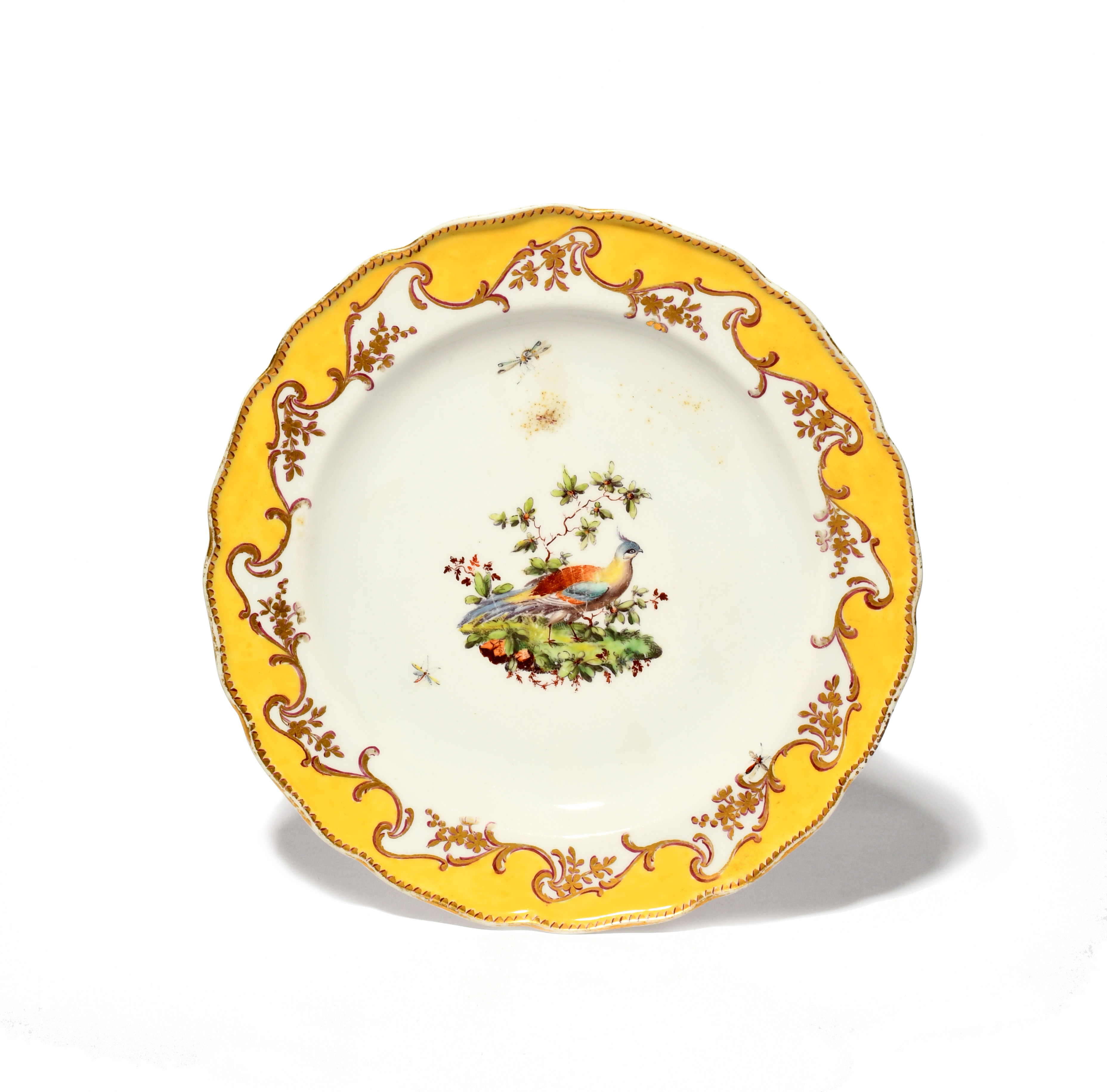 A Chelsea plate c.1760, painted with an exotic bird standing before leafy branches, with flying insects around, within a shaped yellow rim edged with gilt foliate scrolls, puce anchor mark, some wear to the gilt rim, 20.5cm.