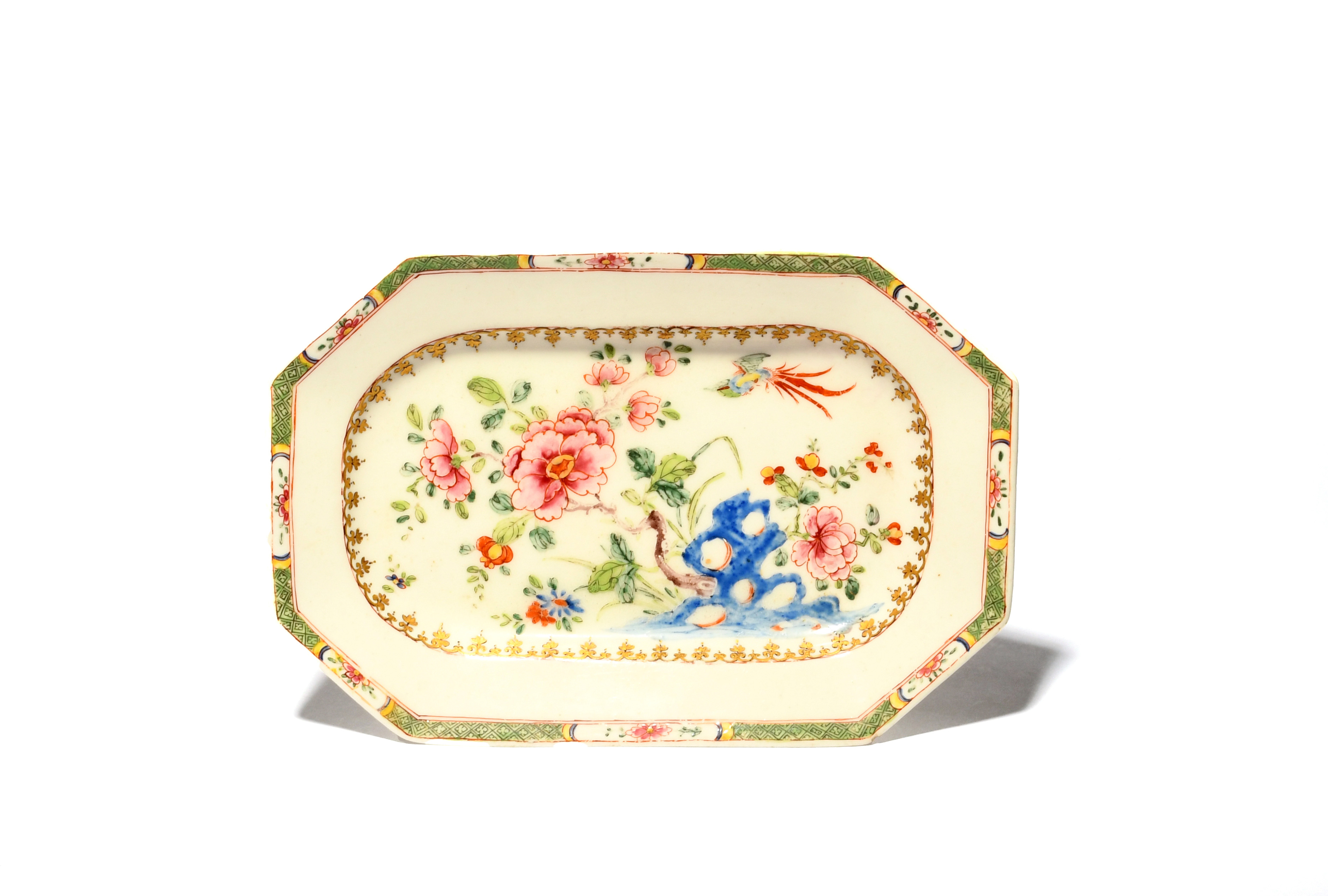 An early Bow oblong dish, c.1753, of elongated octagonal form, painted with a long-tailed bird in